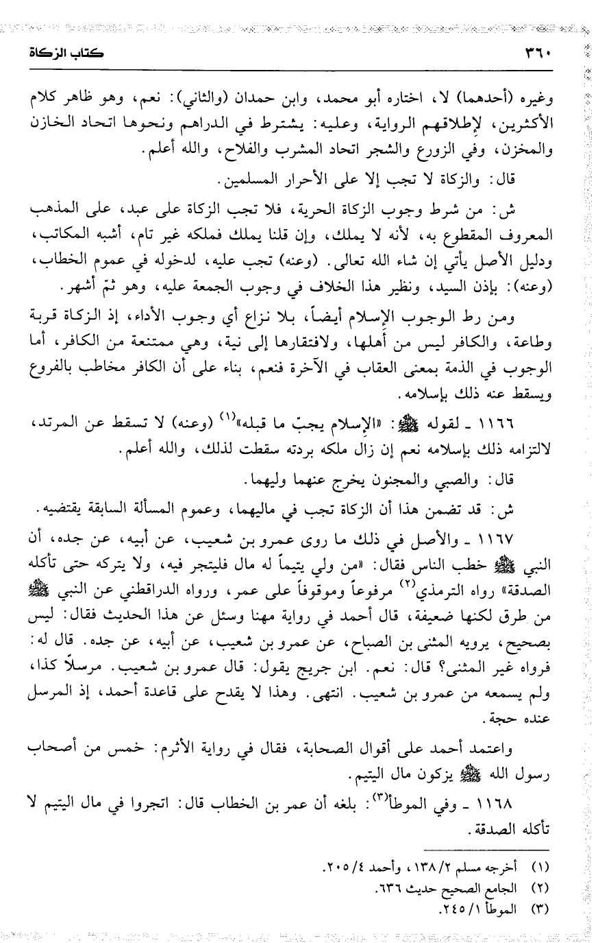 1167 والأصل في ذلك ما روى عمرو بن شعيب ، عن أبيه ، عن جده ، أن النبي خطب الناس فقال : ( من ولي يتيماً له مال فليتجر فيه ، ولا يتركه حتى تأكله الصدقة ) رواه الترمذي مرفوعاً وموقوفاً على عمر ، ورواه الدراقطني عن النبي من طرق لكنها ضعيفة ، قال أحمد في رواية مهنا وسئل عن هذا الحديث فقال : ليس بصحيح ، يرويه المثنى بن الصباح ، عن عمرو بن شعيب ، عن أبيه ، عن جده . قال له : فرواه غير المثنى ؟ قال : نعم . ابن جريج يقول : قال عمرو بن شعيب . مرسلًا كذا ، ولم يسمعه من عمرو بن شعيب . انتهى . وهذا لا يقدح على قاعدة أحمد ، إذ المرسل عنده حجة .