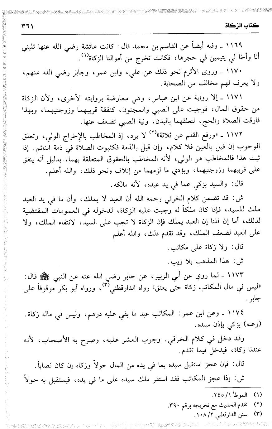 1169 وفيه أيضاً عن القاسم بن محمد قال : كانت عائشة رضي الله عنها تليني أنا وأخا لي يتيمين في حجرها ، فكانت تخرج من أموالنا الزكاة .