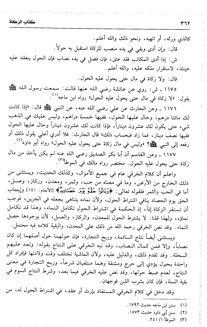 1177 وعن القاسم أن أبا بكر [ الصديق ] رضي الله عنه لم يكن [ يأخذ ] من مال زكاة حتى يحول عليه الحول . مختصر رواه مالك في الموطأ .