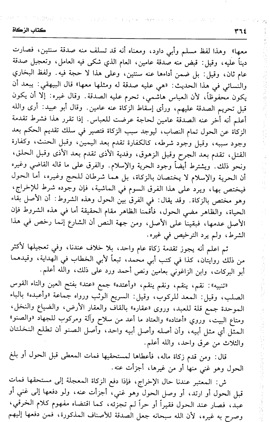 معها ) وهذا لفظ مسلم وأبي داود ، ومعناه أنه قد تسلف منه صدقة سنتين ، فصارت ديناً عليه ، وقيل : قبض منه صدقة عامين ، العام الذي شكى فيه العامل ، وتعجيل صدقة عام ثان ، وقيل : بل ضمن أداءها عنه سنتين ، وعلى هذا لا حجة فيه . ولفظ البخاري والنسائي في هذا الحديث : ( هي عليه صدقة له ومثلها معها ) قال البيهقي : يبعد أن يكون محفوظاً ، لأن العباس هاشمي ، تحرم عليه الصدقة . وقال غيره : إلا أن يكون [ قبل ] تحريم الصدقة عليهم ، ورأى إسقاط الزكاة عنه عامين . وقال أبو عبيد : أرى والله أعلم أنه أخر عنه الصدقة عامين لحاجة عرضت للعباس . إذا تقرر هذا فشرط تقدمة الزكاة عن الحول تمام النصاب ، ليوجد سبب الزكاة فتصير في سلك تقديم الحكم بعد وجود سببه ، وقبل وجود شرطه ، كالكفارة تقدم بعد اليمين ، وقبل الحنث ، وكفارة القتل ، تقدم بعد الجرح وقبل الزهوق ، وفدية الأذى تقدم بعد الأذى وقبل الحلق ، ونحو ذلك . ويشترط أيضاً وجود الحرية والإسلام . والفرق على ما قاله القاضي وغيره أن الحرية والإسلام لا يختصان بالزكاة ، بل هما شرطان للحج وغيره ، أما الحول فيختص بها ، ويرد على هذا الفرق السوم في الماشية ، فإن وجوده شرط للإخراج ، وهو مختص بالزكاة . وقد يقال : [ في الفرق ] بين الحول وهذه الشروط : أن الأصل بقاء الحياة ، والظاهر مضي الحول ، فأقمنا الظاهر مقام الحقيقة أما في هذه الشروط فإن الأصل عدمها ، فبقينا على الأصل ، ومن جهة النص أن الشارع إنما رخص في هذا الشرط ، ولم يرد الترخيص في غيره .