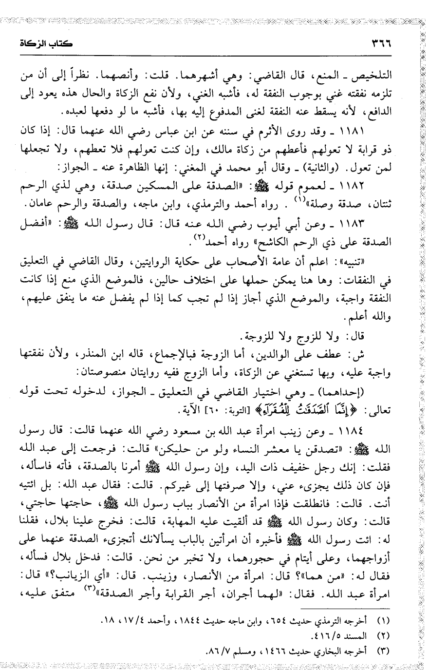 1184 وعن زينب امرأة عبد الله بن مسعود رضي الله عنهما قالت : قال رسول الله : ( تصدقن يا معشر النساء ولو من حليكن ) قالت : فرجعت إلى عبد الله فقلت : إنك رجل خفيف ذات اليد ، وإن رسول الله أمرنا بالصدقة ، فأته فاسأله ، فإن كان ذلك يجزيء عني ، وإلا صرفتها إلى غيركم . قالت : فقال عبد الله : بل ائتيه أنت . قالت : فانطلقت فإذا امرأة [ من الأنصار ] بباب رسول الله ، حاجتها حاجتي ، قالت : وكان رسول الله قد ألقيت عليه المهابة ، قالت : فخرج علينا بلال ، فقلنا له : ائت رسول الله فأخبره أن امرأتين بالباب يسألانك أتجزيء الصدقة عنهما على أزواجهما ، وعلى أيتام في حجورهما ، ولا تخبر من نحن . قالت : فدخل [ بلال ] فسأله ، فقال له : ( من هما ) ؟ قال : امرأة من الأنصار ، وزينب . قال : ( أي الزيانب ؟ ) قال : امرأة عبد الله . فقال : ( لهما أجران ، أجر القرابة وأجر الصدقة ) متفق عليه ،