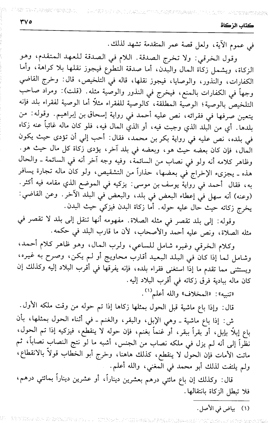 وقول الخرقي : ولا تخرج الصدقة . اللام في الصدقة للعهد المتقدم ، وهو الزكاة ، ويشمل زكاة المال والبدن ، أما صدقة التطوع فيجوز نقلها بلا كراهة ، وأما الكفارات ، والنذور ، والوصايا ، فيجوز نقلها ، قاله في التلخيص ، [ قال ] : وخرج القاضي وجهاً في الكفارات بالمنع ، فيخرج في النذور والوصية مثله . ( قلت ) : ومراد صاحب التلخيص بالوصية ؛ الوصية المطلقة ، كالوصية للفقراء [ مثلًا ] أما الوصية لفقراء بلد فإنه يتعين صرفها في فقرائه ، نص عليه أحمد في رواية إسحاق بن إبراهيم . وقوله : من بلدها . أي [ من ] البلد الذي وجبت فيه ، أو الذي المال فيه ، فلو كان ماله غائباً عنه زكاه في بلده ، نص عليه في رواية بكر بن محمد ، فقال : أحب إلي أن تؤدي حيث يكون المال ، فإن كان بعضه حيث هو ، وبعضه في بلد آخر ، يؤدي زكاة كل مال حيث هو . وظاهر كلامه أنه ولو في نصاب من السائمة ، وفيه وجه آخر أنه في السائمة والحال هذه يجزيء الإخراج في بعضها ، حذاراً من التشقيص ، ولو كان ماله تجارة يسافر به ، فقال أحمد في رواية يوسف بن موسى : يزكيه في الموضع الذي مقامه فيه أكثر . ( وعنه ) أنه سهل في إعطاء البعض في بلد ، والبعض في البلد الآخر . وعن القاضي : يخرج زكاته حيث حال [ عليه ] حوله . أما زكاة البدن فيزكي حيث البدن .
