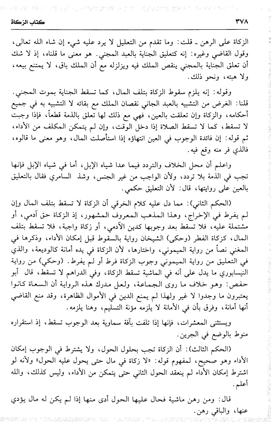 الزكاة على الرهن قلت : وما تقدم من التعليل لا يرد عليه شيء إن شاء الله تعالى ، وقول القاضي وغيره : أنه كتعليق الجناية بالعبد المجني . هو معنى ما قلناه ، إذ لا شك أن تعلق الجناية بالمجني ينقص الملك فيه [ ويزلزله ] مع أن الملك باق ، لا يمتنع بيعه ، ولا هبته ، ونحو ذلك .