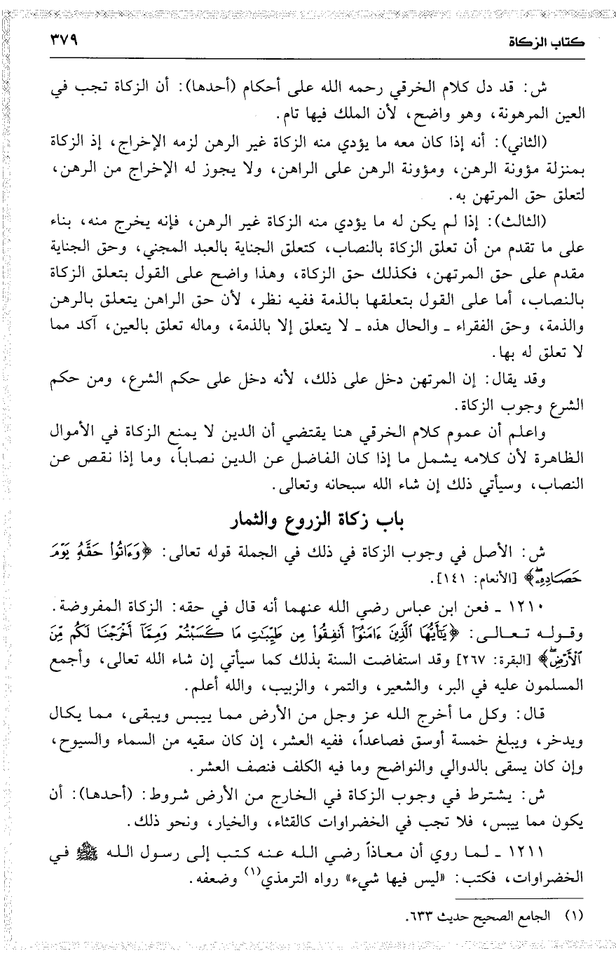 ش : قد دل كلام الخرقي رحمه الله على أحكام ( أحدها ) : أن الزكاة تجب في العين المرهونة ، وهو واضح ، لأن الملك فيها تام .