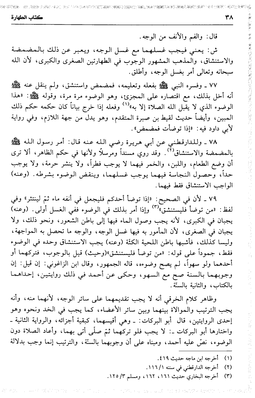 77 وفسره النبي بفعله وتعليمه ، فمضمض واستنشق ، ولم ينقل عنه أنه أخل بذلك ، مع اقتصاره على المجزئ ، وهو الوضوء مرة مرة ، وقوله : ( هذا الوضوء الذي لا يقبل الله الصلاة إلا به ) وفعله إذا خرج بياناً كان حكمه حكم ذلك المبين ، وأيضاً حديث لقيط بن صبرة المتقدم ، وهو يدل من جهة اللازم ، وفي رواية لأبي داود فيه : ( إذا توضأت فمضمض ) .