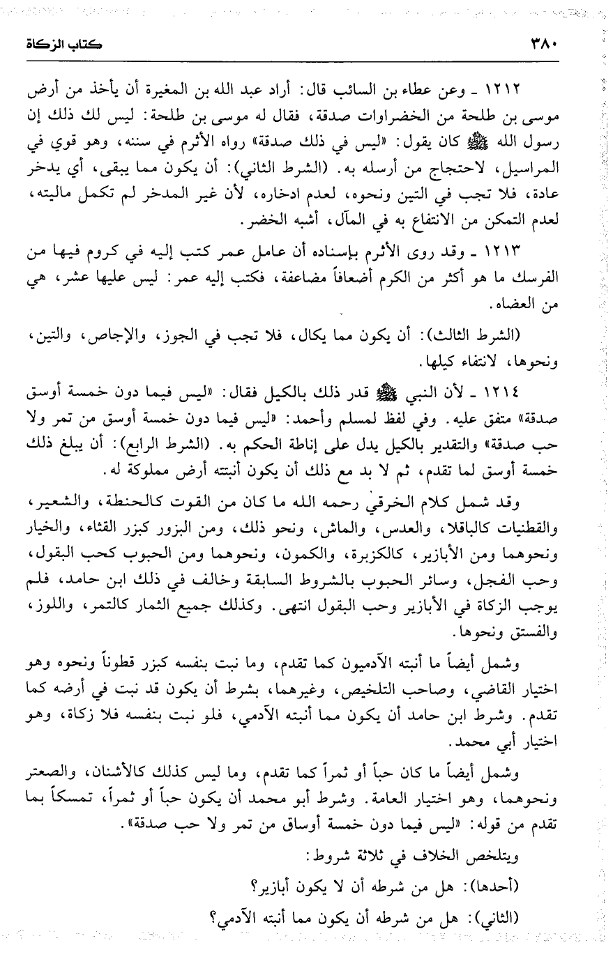 1212 وعن عطاء بن السائب قال : أراد عبد الله بن المغيرة أن يأخذ من أرض موسى بن طلحة من الخضراوات صدقة ، فقال له موسى [ بن طلحة ] : ليس لك ذلك إن رسول الله كان يقول : ( ليس في ذلك صدقة ) رواه الأثرم في سننه ، وهو قوي في المراسيل ، لاحتجاج من أرسله به . ( الشرط الثاني ) : أن يكون مما يبقى ، أي يدخر عادة ، فلا تجب في التين ونحوه ، لعدم ادخاره ، لأن غير المدخر لم تكمل ماليته ، لعدم التمكن من الانتفاع به في المآل ، أشبه الخضر .
