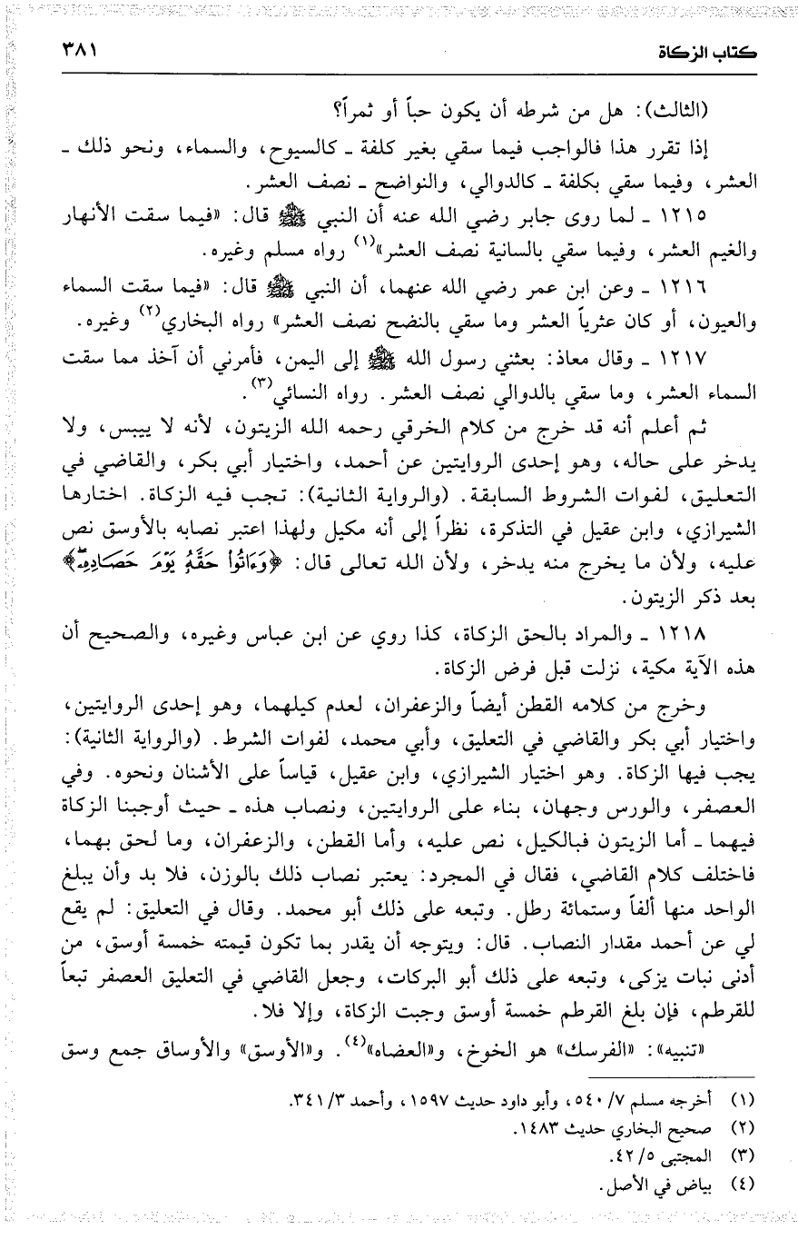 وخرج من كلامه القطن أيضاً والزعفران ، لعدم كيلهما ، وهو إحدى الروايتين ، واختيار أبي بكر والقاضي في التعليق ، وأبي محمد ، لفوات الشرط . ( والرواية الثانية ) : يجب فيها الزكاة . وهو اختيار الشيرازي ، وابن عقيل ، قياساً على الأشنان ونحوه . وفي العصفر ، والورس وجهان ، بناء على الروايتين ، ونصاب هذه حيث أوجبنا الزكاة فيهما أما الزيتون فبالكيل ، نص عليه ، وأما القطن ، والزعفران ، وما لحق بهما ، فاختلف كلام القاضي ، فقال في المجرد : يعتبر نصاب ذلك بالوزن ، فلا بد وأن يبلغ الواحد منها ألفاً وستمائة رطل . وتبعه على ذلك أبو محمد . وقال في التعليق : لم يقع لي عن أحمد مقدار النصاب . قال : ويتوجه أن يقدر بما تكون قيمته خمسة أوسق ، من أدنى نبات يزكى ، وتبعه على ذلك أبو البركات ، وجعل القاضي في التعليق العصفر تبعاً للقرطم ، فإن بلغ القرطم خمسة أوسق وجبت الزكاة ، وإلا فلا .