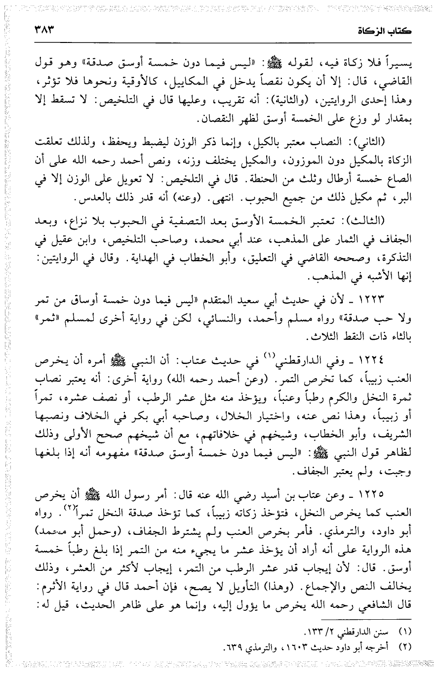 1223 لأن في حديث أبي سعيد المتقدم ( ليس فيما دون خمسة أوساق من تمر ولا حب صدقة ) رواه مسلم وأحمد ، والنسائي ، لكن في رواية أخرى لمسلم ( ثمر ) بالثاء ذات النقط الثلاث .