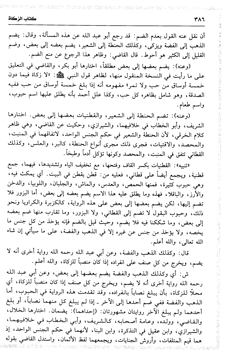 أن نقل عنه القول بعدم الضم : قد رجع أبو عبد الله عن هذه المسألة ، وقال : يضم الذهب إلى الفضة ويزكى ، وكذلك الحنطة إلى الشعير ، يضم بعضه إلى بعض ، وضم القليل إلى الكثير هو أحوط . قال القاضي : وظاهر هذا الرجوع عن منع الضم .