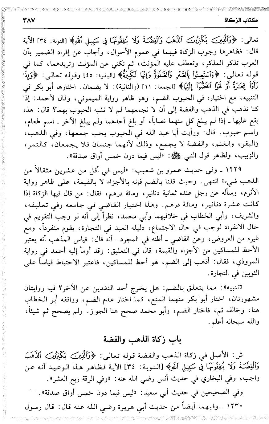 تعالى : 19 ( { والذين يكنزون الذهب والفضة ، ولا ينفقونها في سبيل الله } ) الآية قال : فظاهرها وجوب الزكاة فيهما في عموم الأحوال ، وأجاب عن إفراد الضمير بأن العرب تذكر المذكر ، وتعطف عليه المؤنث ، ثم تكني عن المؤنث وتريدهما ، كما في قوله تعالى : 19 ( { واستعينوا بالصبر والصلاة ، وإنها لكبيرة } ) وقوله تعالى : 19 ( { وإذا رأوا تجارة أو لهواً انفضوا إليها } ) ( والثانية ) : لا يضمان . اختارها أبو بكر في التنبيه ، مع اختياره في الحبوب الضم ، وهو ظاهر رواية الميموني ، وقال لأحمد : إذا كنا نذهب في الذهب والفضة إلى أن لا نجمعهما [ لم لا نشبه الحبوب بهما ؟ قال : هذه يقع عليها إذا لم يبلغ كل منهما نصاباً ، أو بلغ أحدهما ولم يبلغ الآخر اسم طعام ، واسم حبوب . قال : ورأيت أبا عبد الله في الحبوب يحب جمعها ] ، وفي الذهب ، والبقر ، والغنم ، والفضة لا يجمع ، وذلك لأنهما جنسان فلا يجمعان ، كالتمر ، والزبيب ، ولظاهر قول النبي : ( ليس فيما [ دون ] خمس أواق صدقة ) .