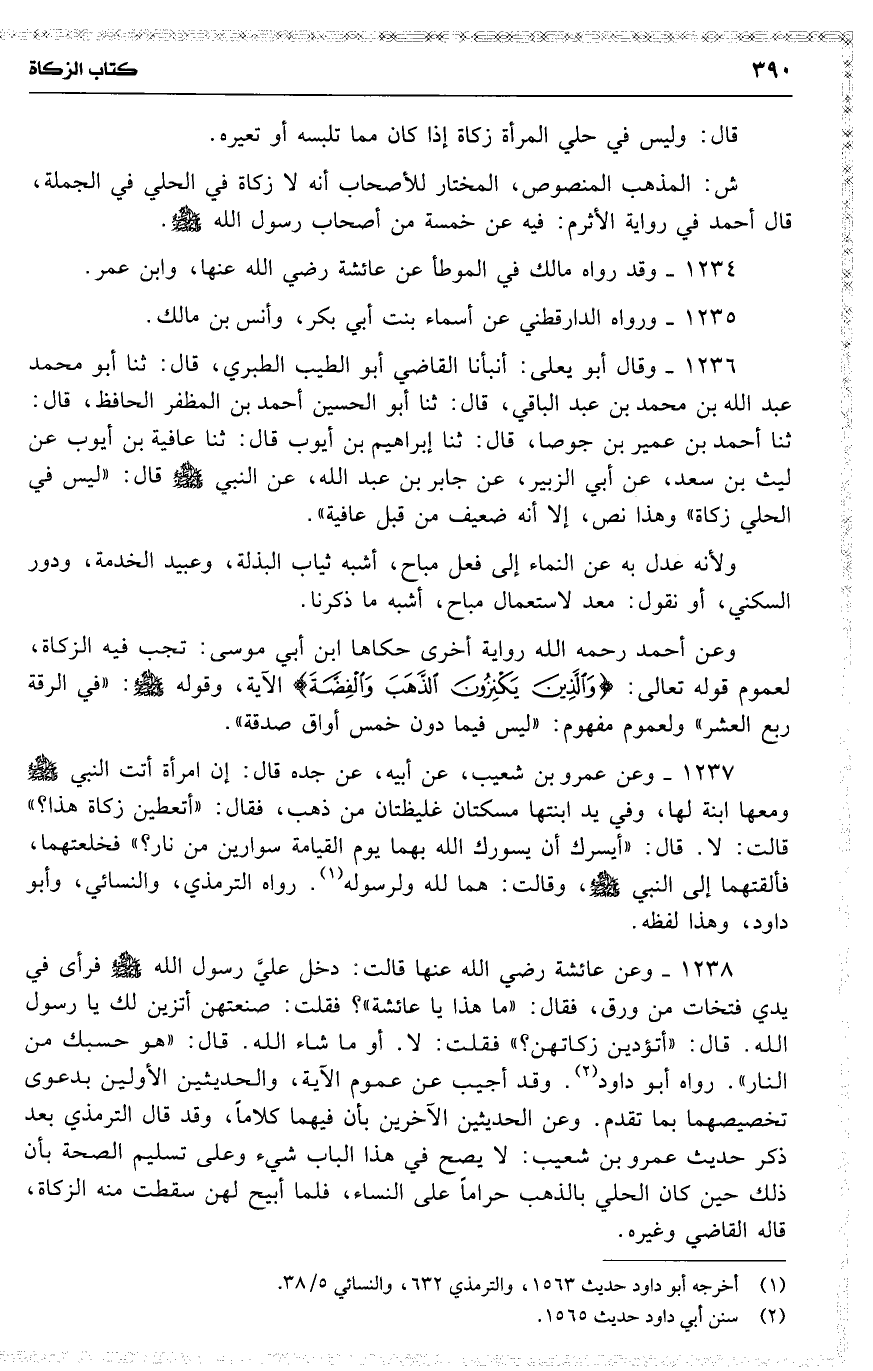 1238 وعن عائشة رضي الله عنها قالت : دخل عليَّ رسول الله فرأى في يدي فتخات من ورق ، فقال : ( ما هذا يا عائشة ) ؟ فقلت : صنعتهن أتزين لك يا رسول الله . قال : ( أتؤدين زكاتهن ؟ ) فقلت : لا . أو ما شاء الله . قال : ( هو حسبك من النار ) . رواه أبو داود . وقد أجيب عن عموم الآية ، والحديثين الأولين بدعوى تخصيصهما بما تقدم . وعن الحديثين الآخرين بأن فيهما كلاماً ، وقد قال الترمذي بعد ذكر حديث عمرو بن شعيب : لا يصح في هذا الباب شيء وعلى تسليم الصحة بأن ذلك حين كان الحلي بالذهب حراماً على النساء ، فلما أبيح لهن سقطت منه الزكاة ، قاله القاضي وغيره .