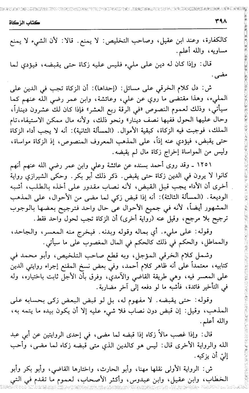 1251 وقد روى أحمد بسنده عن عائشة وعلي [ وابن عمر رضي الله عنهم ] أنهم كانوا لا يرون في الدين زكاة حتى يقبض . ذكر ذلك أبو بكر . وحكى الشيرازي رواية أخرى أن الأداء يجب قبل القبض ، لأنه نصاب مقدور على أخذه بالطلب ، أشبه الوديعة . ( المسألة الثالثة ) : أنه إذا قبض زكي لما مضى من الأحوال ، على المذهب المشهور أيضاً ، لأنه في جميع الأحوال عى حال [ واحد ] فترجيح بعضها بالوجوب [ ترجيح ] بلا مرجح ، وقيل عنه ( رواية أخرى ) أن الزكاة تجب لحول واحد فقط .