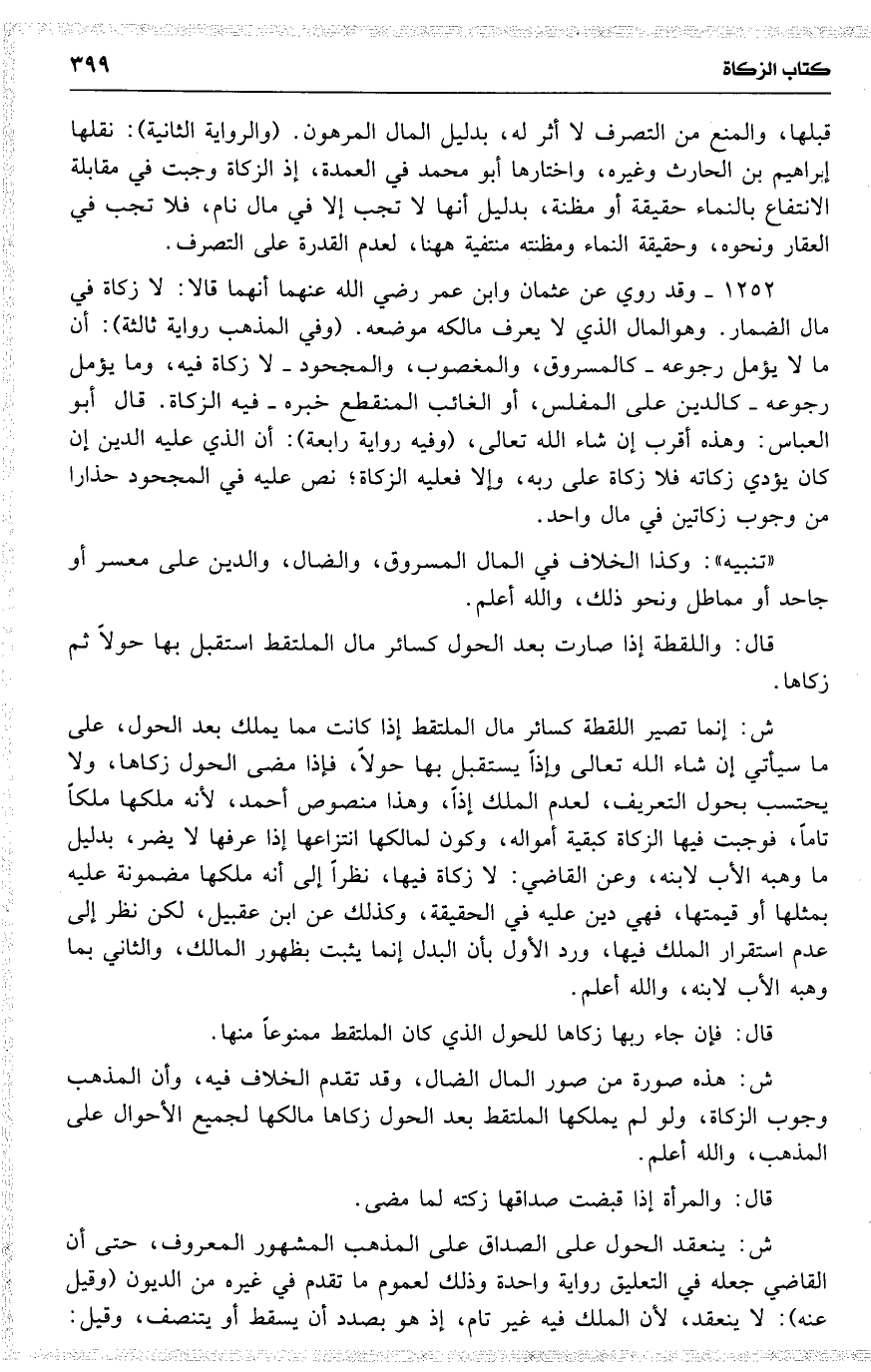 قبلها ، والمنع [ من ] التصرف لا أثر له ، بدليل المال المرهون . ( والرواية الثانية ) : نقلها إبراهيم بن الحارث وغيره ، واختارها أبو محمد في العمدة ، إذ الزكاة وجبت في مقابلة الانتفاع بالنماء حقيقة أو مظنة ، بدليل أنها لا تجب إلا في مال نام ، فلا تجب في العقار ونحوه ، وحقيقة النماء ومظنته منتفية ههنا ، لعدم القدرة على التصرف .