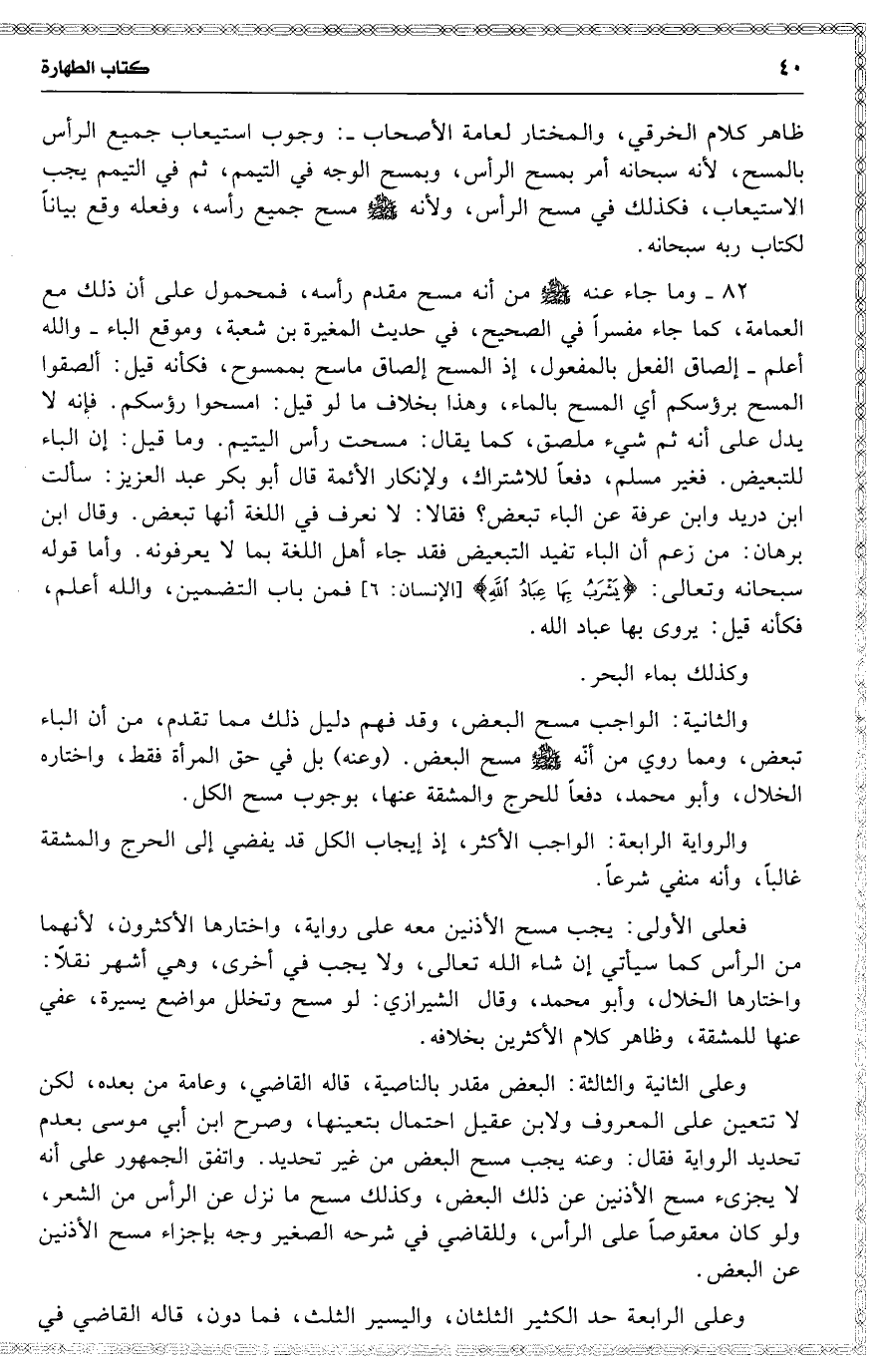 82 وما جاء عنه من أنه مسح مقدم رأسه ، فمحمول على أن ذلك مع العمامة ، كما جاء مفسراً في الصحيح ، في حديث المغيرة بن شعبة ، وموقع الباء والله أعلم إلصاق الفعل بالمفعول ، إذ المسح إلصاق ماسح بممسوح ، فكأنه قيل : ألصقوا المسح برؤسكم أي المسح بالماء ، وهذا بخلاف ما لو قيل : امسحوا رؤسكم . فإنه لا يدل على أنه ثم شيء ملصق ، كما يقال : مسحت رأس اليتيم . وما قيل : إن الباء للتبعيض . فغير مسلم ، دفعاً للاشتراك ، ولإنكار الأئمة قال أبو بكر عبد العزيز : سألت ابن دريد وابن عرفة عن الباء تبعض ؟ فقالا : لا نعرف في اللغة أنها تبعض . وقال ابن برهان : من زعم أن الباء تفيد التبعيض فقد جاء أهل اللغة بما لا يعرفونه . وأما قوله سبحانه وتعالى : 19 ( { يشرب بها عباد الله } ) فمن باب التضمين ، والله أعلم ، فكأنه قيل : يروى بها عباد الله .