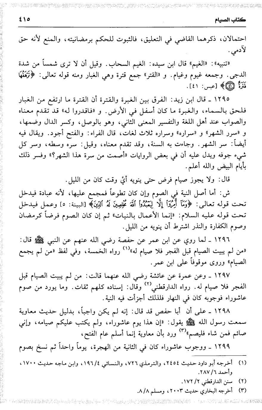 1297 وعن عمرة عن عائشة رضي الله عنهما قالت : من لم يبيت الصيام قبل الفجر فلا صيام له . رواه الدارقطني وقال : إسناده كلهم ثقات . وما يورد من صوم عاشوراء فوجوبه كان في النهار فلذلك أجزأت فيه النية .