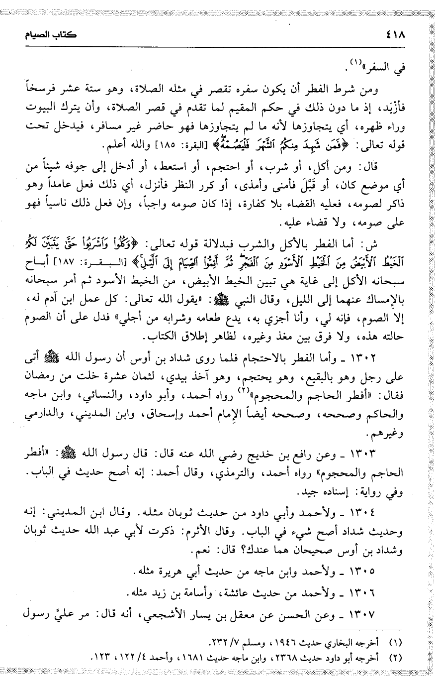 1302 وأما الفطر بالاحتجام فلما روى شداد بن أوس أن رسول الله أتى على رجل وهو بالبقيع ، وهو يحتجم ، وهو آخذ بيدي ، لثمان عشرة خلت من رمضان فقال : ( أفطر الحاجم والمحجوم ) رواه أحمد ، وأبو داود ، والنسائي ، وابن ماجه والحاكم وصححه ، وصححه أيضاً الإِمام أحمد وإسحاق ، وابن المديني ، والدارمي وغيرهم .
