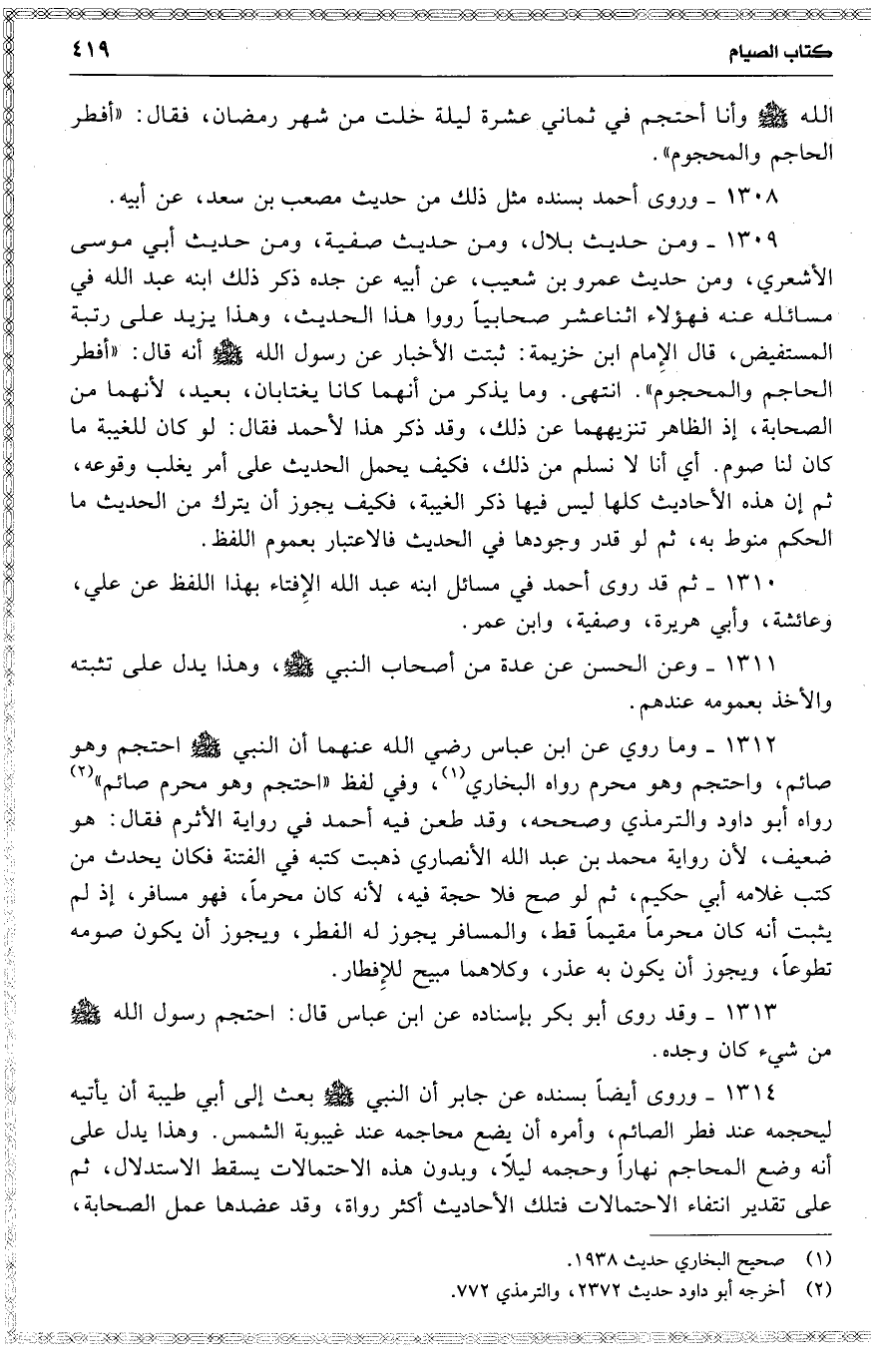 1312 وما روي عن ابن عباس رضي الله عنهما أن النبي احتجم وهو صائم ، واحتجم وهو محرم رواه البخاري ، وفي لفظ ( احتجم وهو محرم صائم ) رواه أبو داود والترمذي وصححه ، ( سقط : إلى آخر الصفحة )