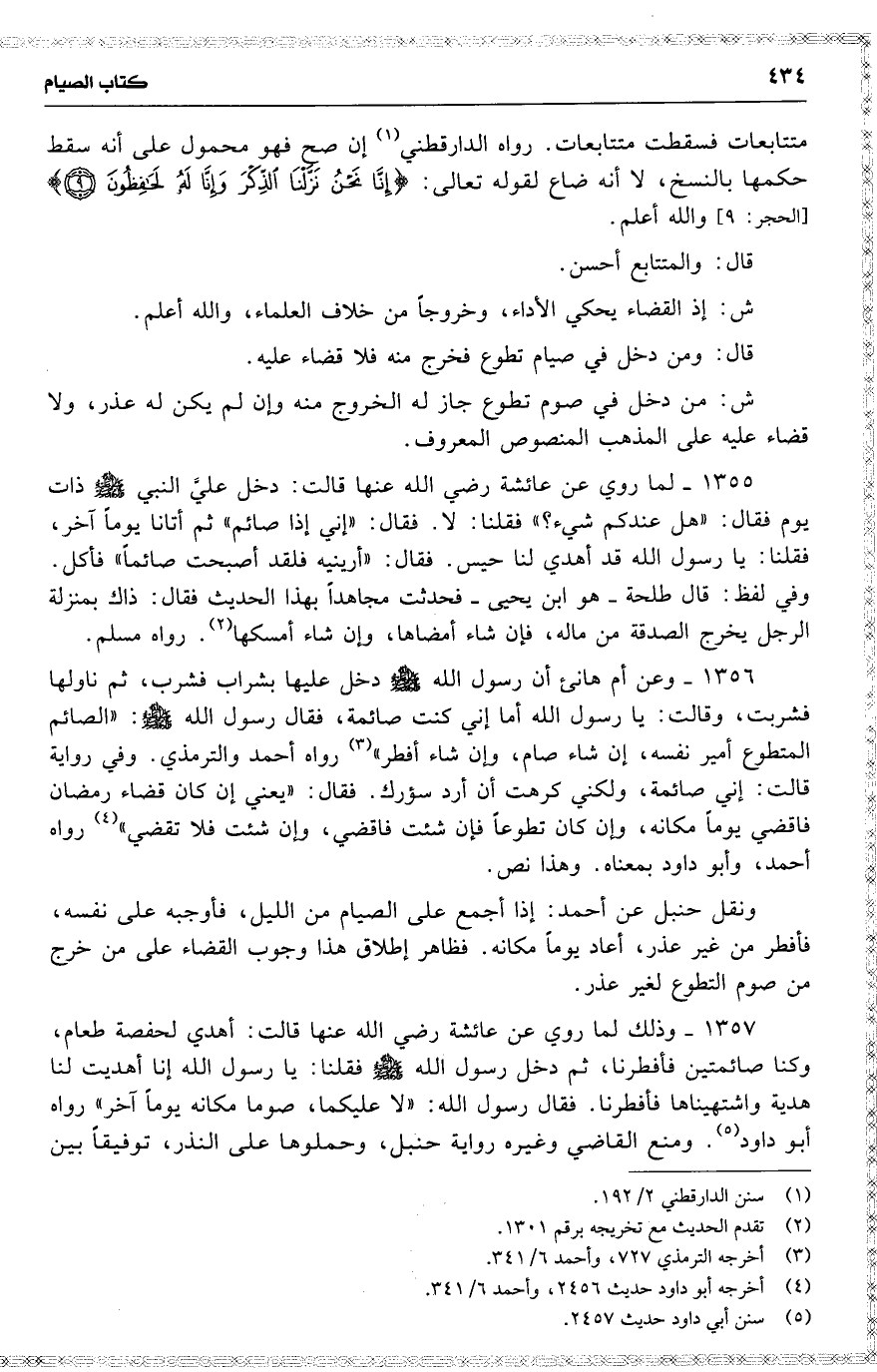 1356 وعن أم هانئ أن رسول الله دخل عليها بشراب فشرب ، ثم ناولها فشربت ، وقالت : يا رسول الله أما إني كنت صائمة ، فقال رسول الله : ( الصائم المتطوع أمير نفسه ، إن شاء صام ، وإن شاء أفطر ) [ رواه أحمد والترمذي ] . وفي رواية قالت : إني صائمة ، ولكني كرهت أن أرد سؤرك . فقال : ( يعني إن كان قضاء رمضان فاقضي يوماً مكانه ، وإن كان تطوعاً فإن شئت فاقضي ، وإن شئت فلا تقضي ) رواه أحمد ، وأبو داود بمعناه . وهذا نص .