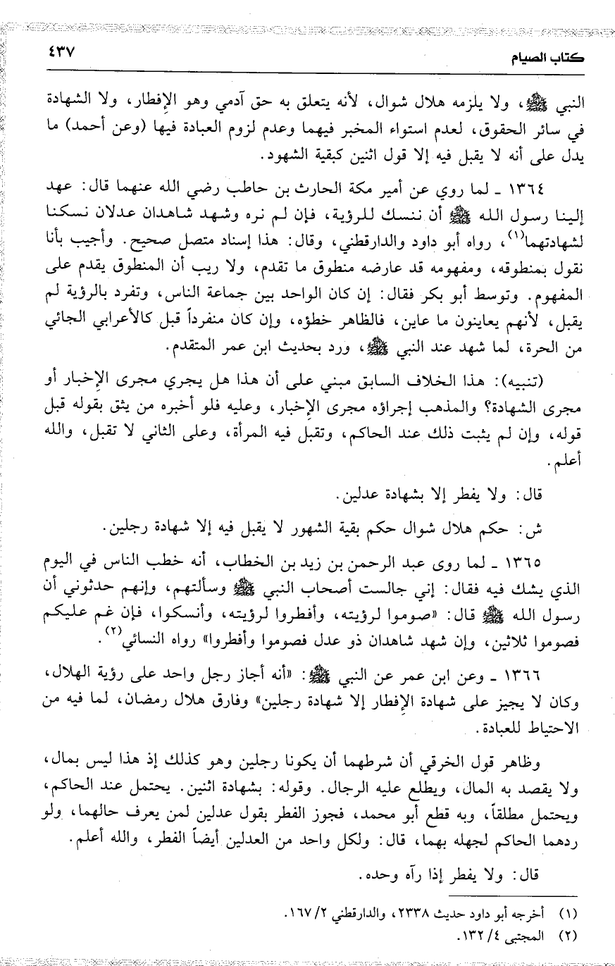1366 وعن ابن عمر عن النبي : ( أنه أجاز رجل واحد على رؤية الهلال ، وكان لا يجيز على شهادة الإِفطار إلا [ شهادة ] رجلين ) وفارق هلال رمضان ، لما فيه من الاحتياط للعبادة .
