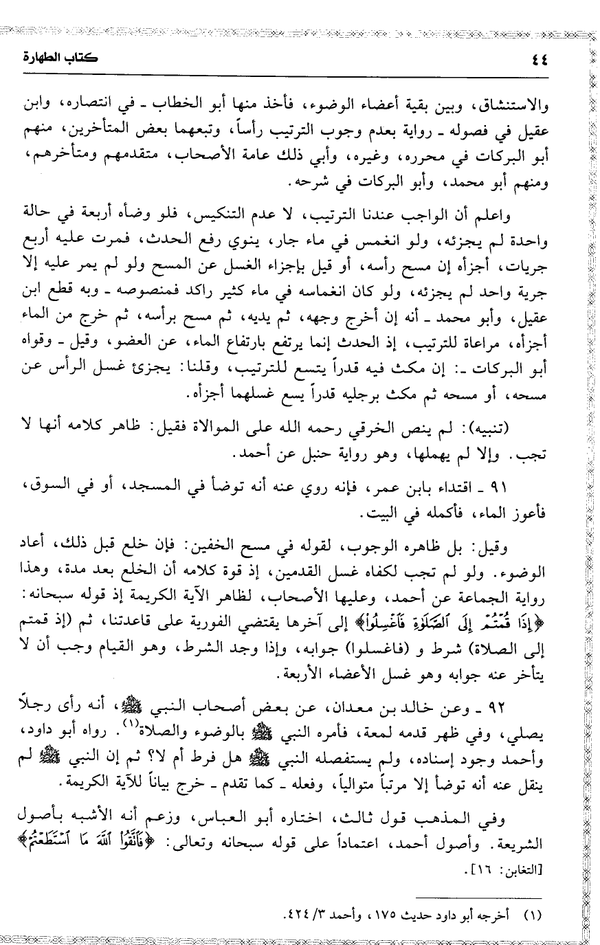 92 وعن خالد بن معدان ، عن بعض أصحاب النبي ، أنه رأى رجلًا يصلي ، وفي ظهر قدمه لمعة ، فأمره النبي بالوضوء والصلاة . رواه أبو داود ، وأحمد وجود إسناده ، ولم يستفصله النبي هل فرط أم لا ؟ ثم إن النبي لم ينقل عنه أنه توضأ إلا مرتباً متوالياً ، وفعله كما تقدم خرج بياناً للآية الكريمة .