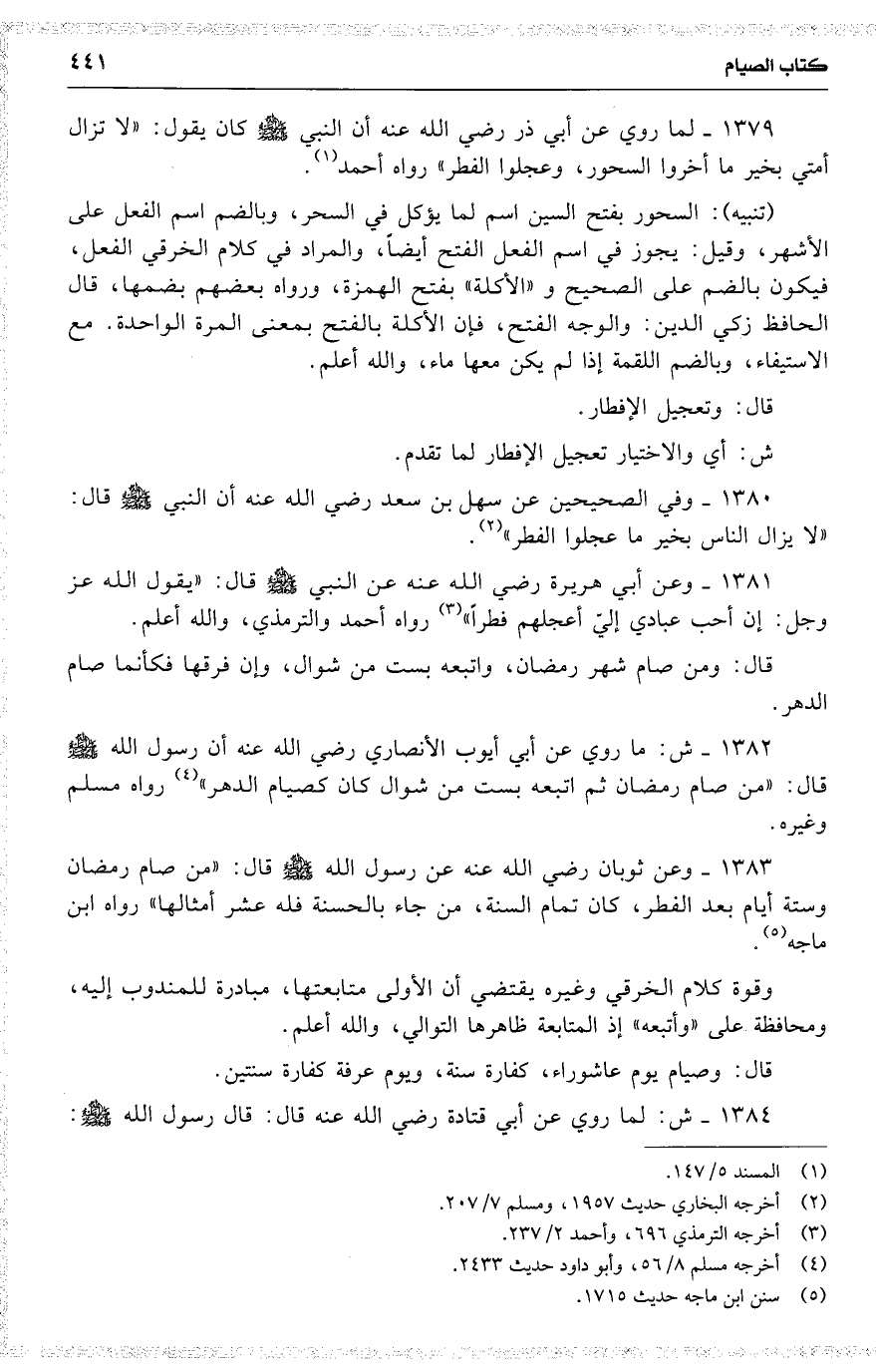 1379 لما روي عن أبي ذر رضي الله عنه أن النبي كان يقول : ( لا تزال أمتي بخير ما [ أخروا ] السحور ، وعجلوا الفطر ) رواه أحمد .