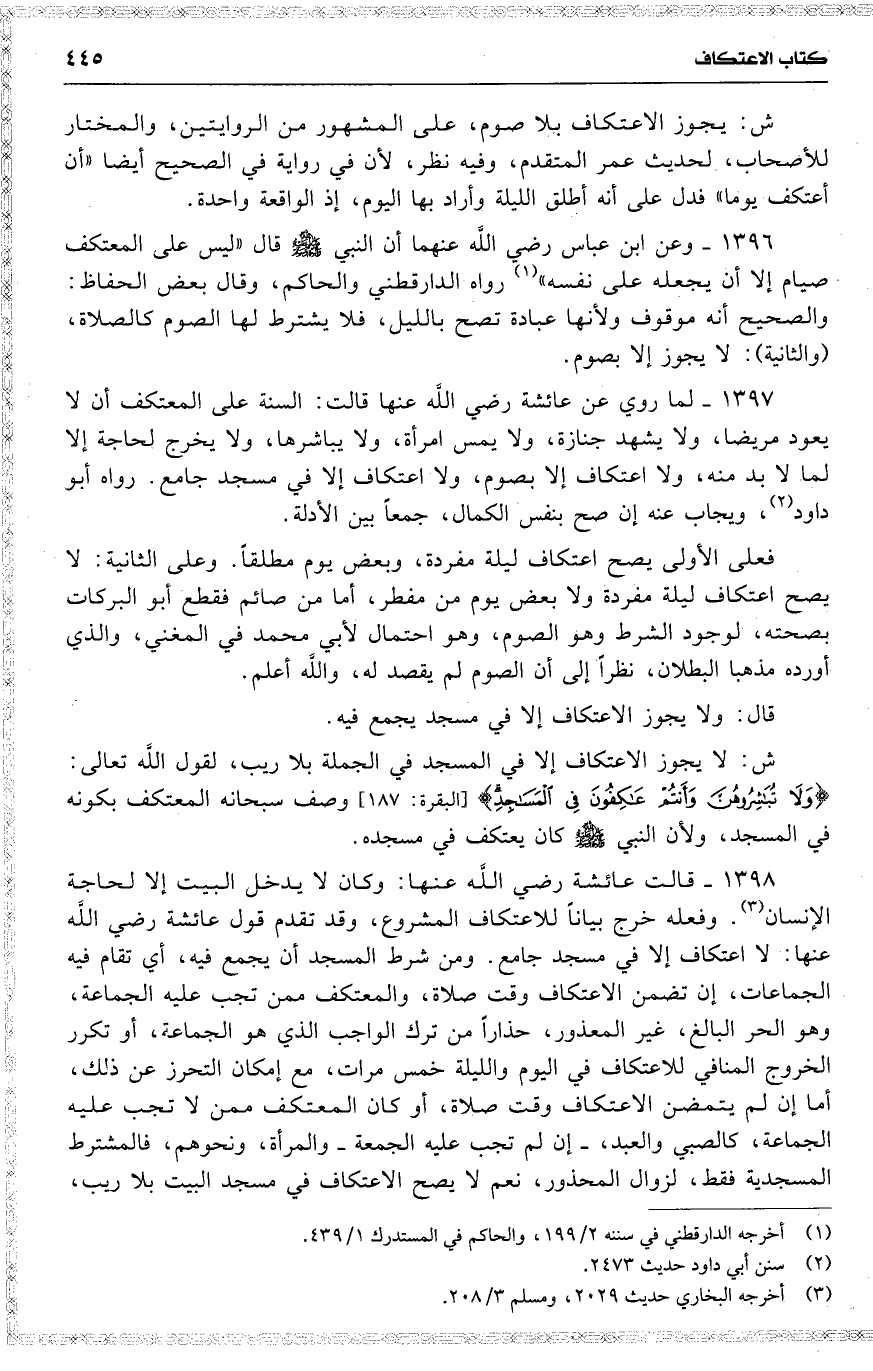 1396 وعن ابن عباس رضي اللَّه عنهما أن النبي قال ( ليس على المعتكف صيام إلا أن يجعله على نفسه ) رواه الدارقطني والحاكم ، وقال بعض الحفاظ : والصحيح أنه موقوف ولأنها عبادة تصح بالليل ، فلا يشترط لها الصوم كالصلاة ، ( والثانية ) : لا يجوز إلا بصوم .