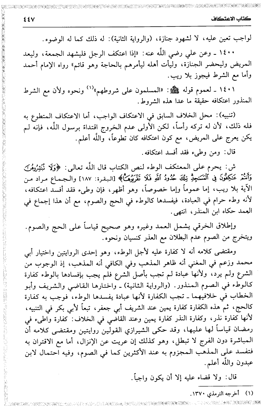 1401 لعموم قوله ( المسلمون على شروطهم ) ونحوه ولأن مع الشرط المنذور اعتكافه حقيقة ما عدا هذه الشروط .