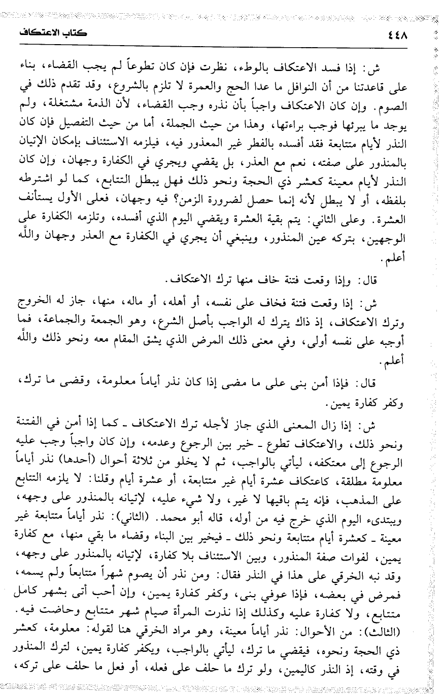 ش : إذا زال المعنى الذي جاز لأجله ترك الاعتكاف كما إذا أمن [ في ] الفتنة ونحو ذلك ، والاعتكاف تطوع خير بين الرجوع وعدمه ، وإن كان واجباً وجب عليه الرجوع إلى معتكفه ، ليأتي بالواجب ، ثم لا يخلو من ثلاثة أحوال ( أحدها ) نذر أياماً معلومة مطلقة ، كاعتكاف عشرة أيام غير متتابعة ، أو عشرة أيام وقلنا : لا يلزمه التتابع على المذهب ، فإنه يتم باقيها لا غير ، ولا شيء عليه ، لإتيانه بالمنذور على وجهه ، ويبتدىء اليوم الذي خرج فيه من أوله ، قاله أبو محمد . ( الثاني ) : نذر أياماً متتابعة غير معينة كعشرة أيام متتابعة ونحو ذلك فيخير بين البناء وقضاء ما بقي منها ، مع كفارة يمين ، لفوات صفة المنقور ، وبين الاستئناف بلا كفارة ، لإتيانه بالمنذور على وجهه ، وقد نبه الخرقي على هذا في النذر فقال : ومن نذر أن يصوم شهراً متتابعاً ولم يسمه ، فمرض في بعضه ، فإذا عوفي بنى ، وكفر كفارة يمين ، وإن أحب أتى بشهر كامل متتابع ، ولا كفارة عليه وكذلك إذا نذرت المرأة صيام شهر متتابع وحاضت فيه . ( الثالث ) : من الأحوال : نذر أياماً معينة ، وهو مراد الخرقي هنا لقوله : معلومة ، كعشر ذي الحجة ونحوه ، فيقضي ما ترك ، ليأتي بالواجب ، ويكفر كفارة يمين ، لترك المنذور في وقته ، إذ النذر كاليمين ، ولو ترك ما حلف على فعله ، أو فعل ما حلف على تركه ،