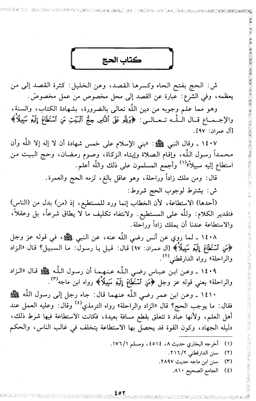 1408 لما روي عن أنس رضي اللَّه عنه ، عن النبي ، في قوله عز وجل 19 ( { من استطاع إليه سبيلا } ) قال : قيل يا رسول : ما السبيل ؟ قال ( الزاد والراحلة ) رواه الدارقطني .