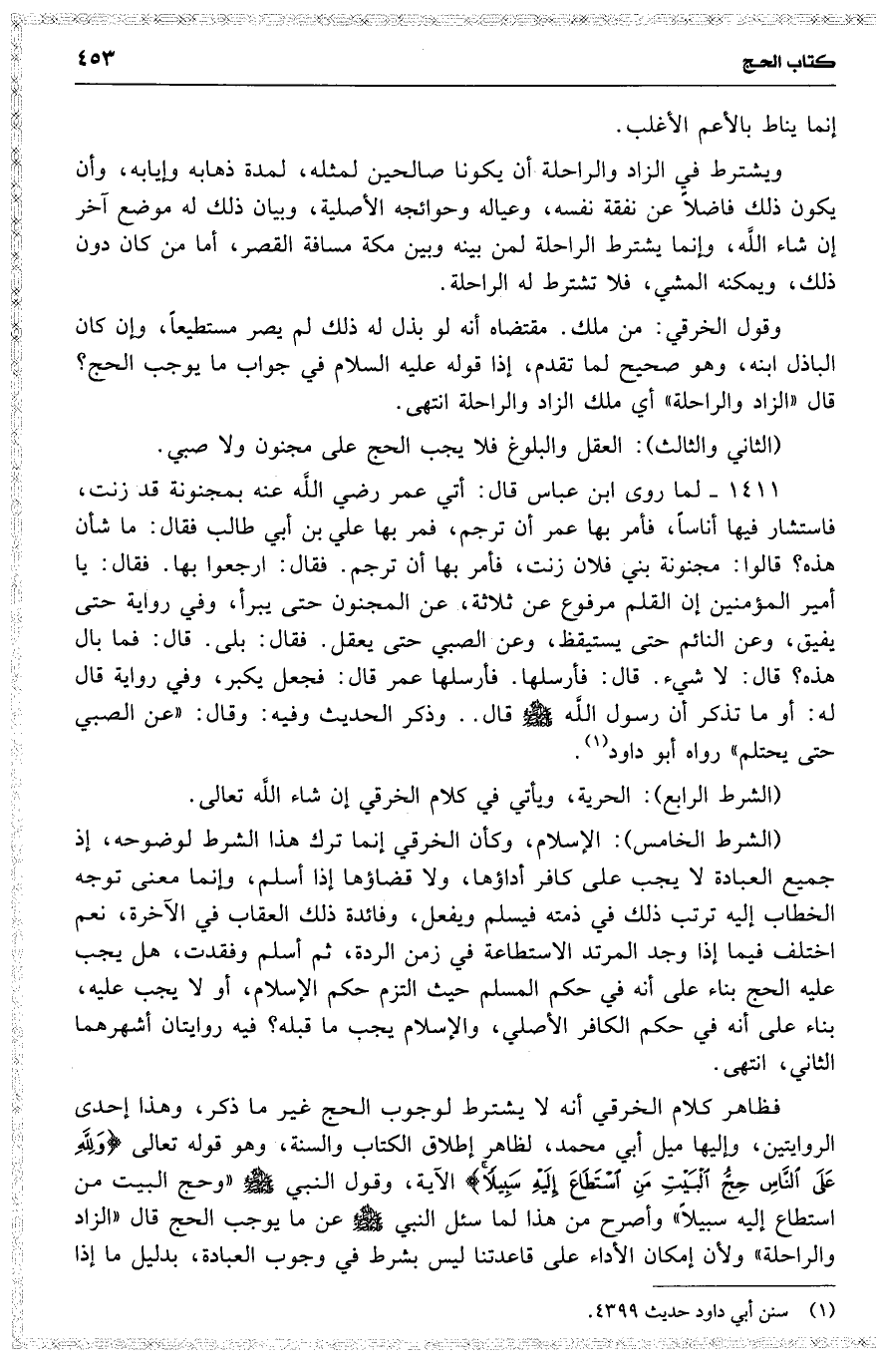 ( الشرط الخامس ) : الإسلام ، وكأن الخرقي إنما ترك هذا الشرط لوضوحه ، إذ جميع العبادة لا يجب على كافر أداؤها ، ولا قضاؤها إذا أسلم ، وإنما معنى توجه الخطاب إليه ترتب ذلك في ذمته فيسلم ويفعل ، وفائدة ذلك العقاب في الآخرة ، نعم اختلف فيما إذا وجد المرتد الاستطاعة في زمن الردة ، ثم أسلم وفقدت ، هل يجب عليه الحج بناء [ على أنه ] في حكم المسلم حيث التزم حكم الإسلام ، أو لا يجب عليه ، بناء [ عى أنه ] في حكم الكافر الأصلي ، والإسلام يجب ما قبله ؟ فيه روايتان أشهرهما الثاني ، انتهى .