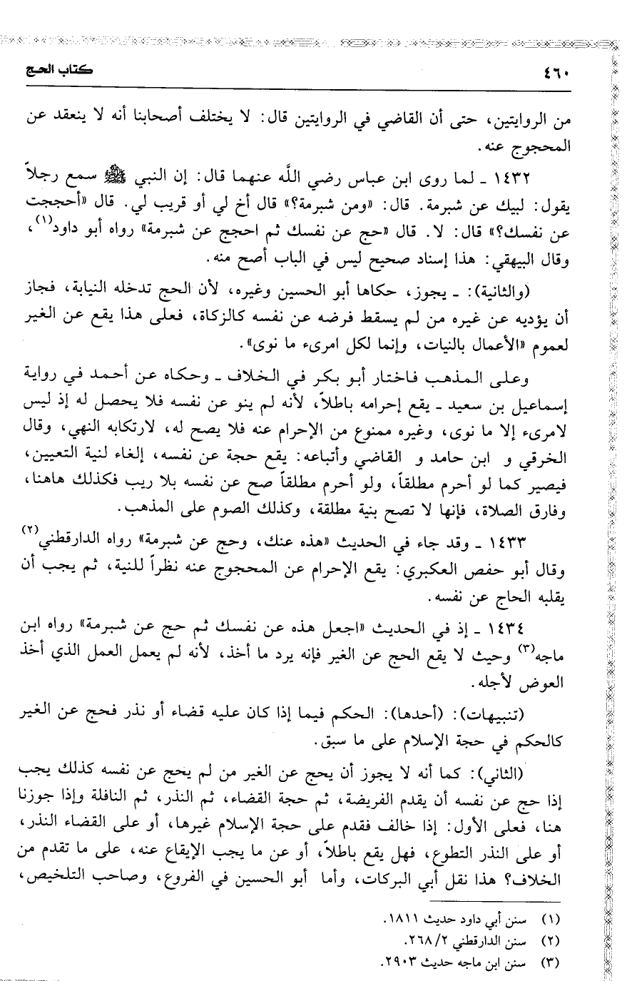 1433 وقد جاء في الحديث ( هذه عنك ، وحج عن شبرمة ) رواه الدارقطني وقال أبو حفص العكبري : يقع الإحرام عن المحجوج [ عنه ] نظراً للنية ، ثم [ يجب أن ] يقلبه الحاج عن نفسه .