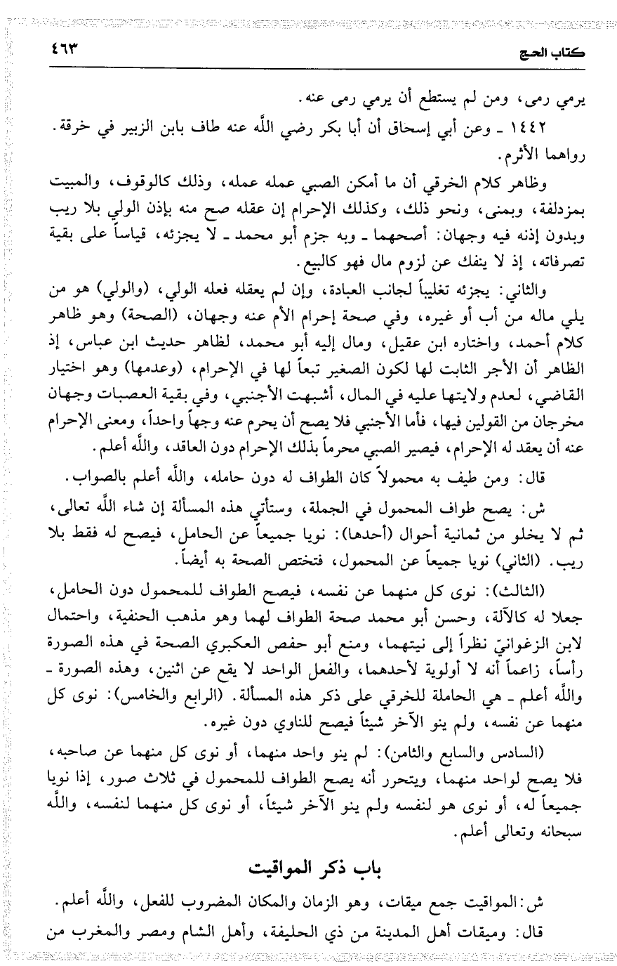 (الثالث): نوى كل منهما عن نفسه، فيصح الطواف للمحمول دون الحامل، جعلا له كالآلة، وحسن أبو محمد صحة الطواف لهما [وهو مذهب الحنفية، واحتمال لابن الزغوانيّ نظراً إلى نيتهما، ومنع أبو حفص العكبري الصحة في هذه الصورة رأساً، زاعماً أنه لا أولوية لأحدهما، والفعل الواحد لا يقع عن اثنين، وهذه الصورة واللَّه أعلم هي الحاملة للخرقي على ذكر هذه المسألة. (الرابع والخامس): نوى كل منهما عن نفسه، ولم ينو الآخر [شيئاً] فيصح للناوي دون غيره.