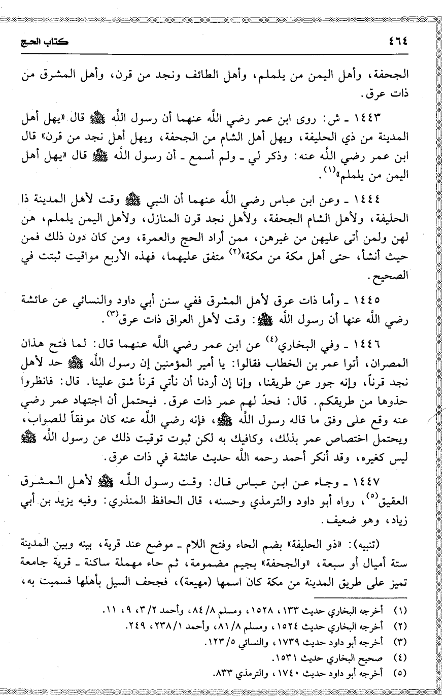 1443 ش : روى ابن عمر رضي اللَّه عنهما أن رسول اللَّه قال ( يهل أهل المدينة من ذي الحليفة ، ويهل أهل الشام من الجحفة ، ويهل أهل نجد من قرن ) قال ابن عمر رضي اللَّه عنه : وذكر لي ولم أسمع أن رسول اللَّه قال ( يهل أهل اليمن من يلملم ) .