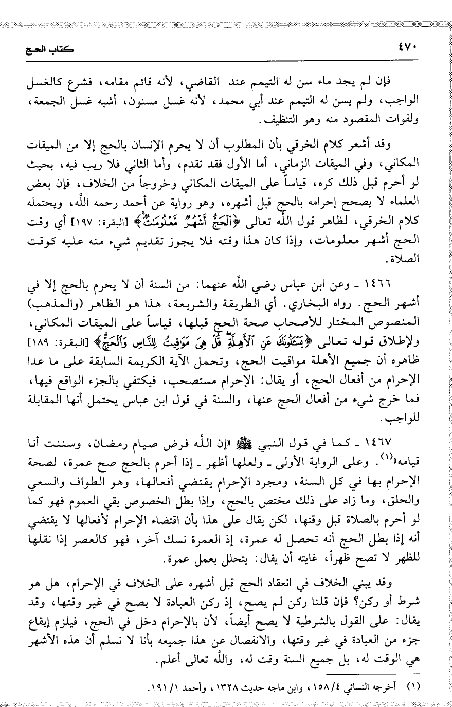 1466 وعن ابن عباس رضي اللَّه عنهما : 16 ( من السنة أن لا يحرم بالحج إلا في أشهر الحج ) . رواه البخاري . أي الطريقة والشريعة ، هذا هو الظاهر ( والمذهب ) المنصوص المختار للأصحاب صحة الحج قبلها ، قياساً على الميقات المكاني ، ولإطلاق قوله تعالى 19 ( { يسألونك عن الأهلة ، قل هي مواقيت للناس والحج } ) ظاهره أن جميع الأهلة مواقيت الحج ، وتحمل الآية الكريمة السابقة على ما عدا الإحرام من أفعال الحج ، أو يقال : الإحرام مستصحب ، فيكتفي بالجزء الواقع فيها ، فما خرج شيء من أفعال الحج عنها ، والسنة في قول ابن عباس يحتلم أنها المقابلة للواجب .