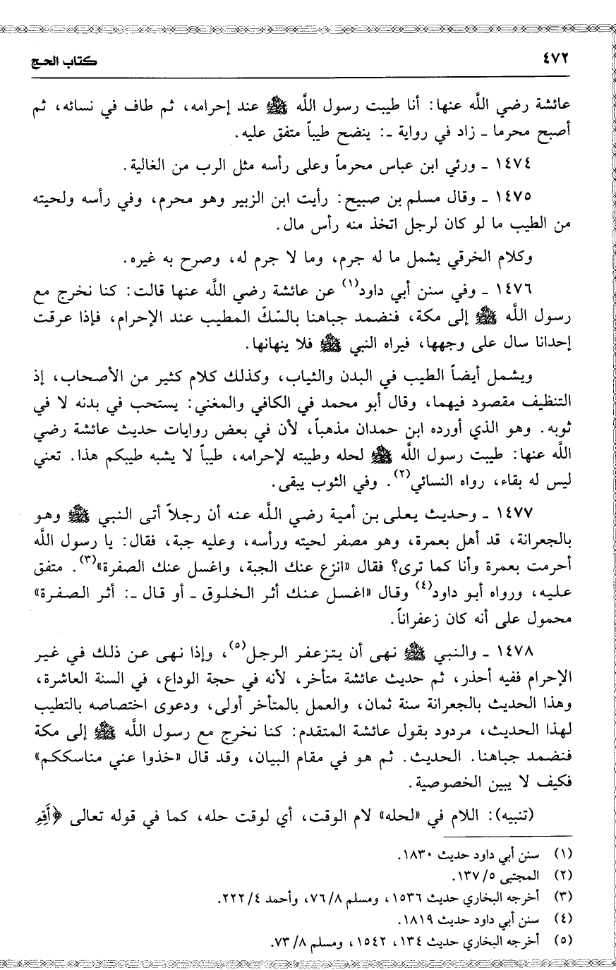 1476 وفي سنن أبي داود عن عائشة رضي اللَّه عنها قالت : كنا نخرج مع رسول اللَّه إلى مكة ، فنضمد جباهنا بالسّكّ المطيب عند الإحرام ، فإذا عرقت إحدانا سال على وجهها ، فيراه النبي فلا ينهانها .