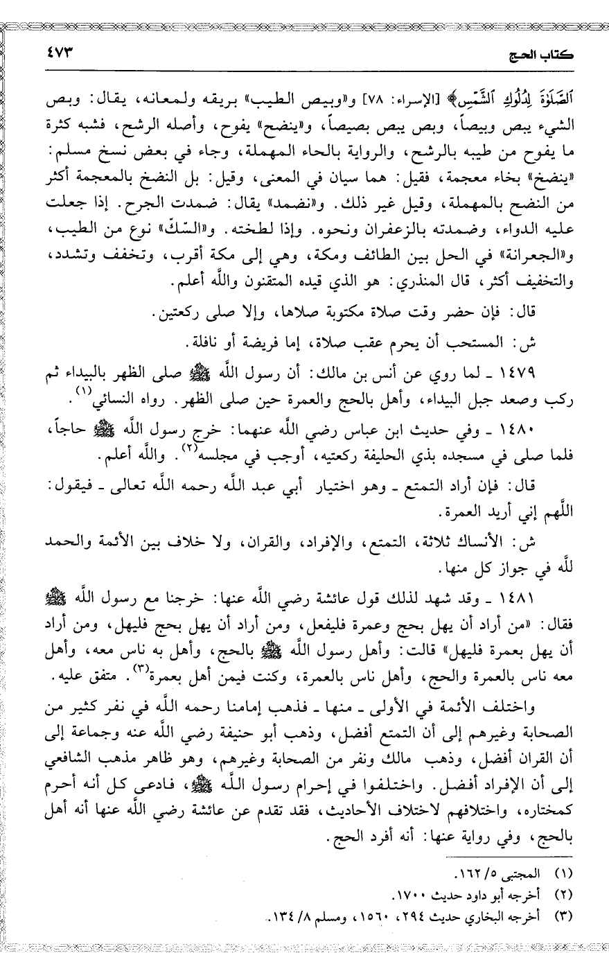 ش : الأنساك ثلاثة ، التمتع ، والإفراد ، والقران ، ولا خلاف بين الأئمة والحمد للَّه في جواز كل منها .