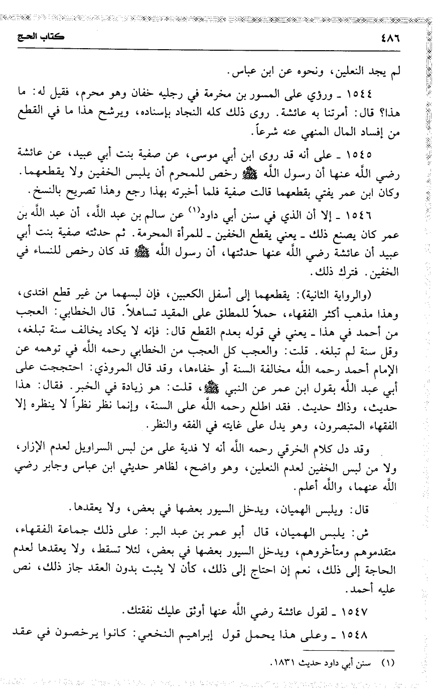 1544 ورؤي على المسور بن مخرمة في رجليه خفان وهو محرم ، فقيل له : 16 ( ما هذا ؟ قال : أمرتنا به عائشة ) . روى ذلك كله النجاد بإسناده ، ويرشج هذا ما في القطع من إفساد المال المنهي عنه شرعاً .