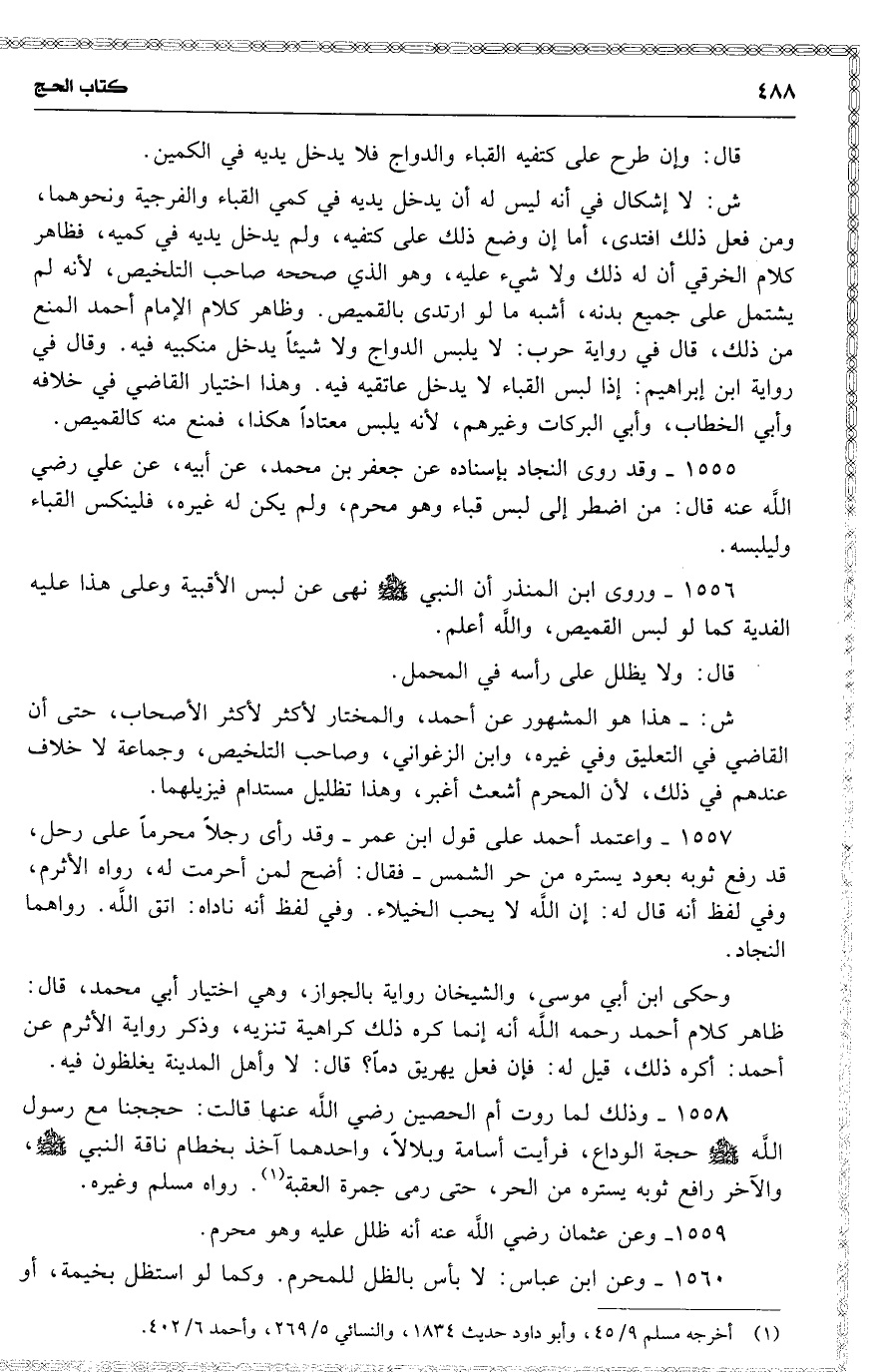 1557 واعتمد أحمد على قول ابن عمر وقد رأى رجلاً محرماً على رحل ، ) 16 ( قد رفع ثوبه بعود يستره منحر الشمس فقال : 16 ( أضح لمن أحرمت له ) ، رواه الأثرم ، وفي لفظ أنه قال له : إن اللَّه لا يحب الخيلاء . وفي لفظ أنه ناداه : اتق اللَّه . رواهما النجاد .
