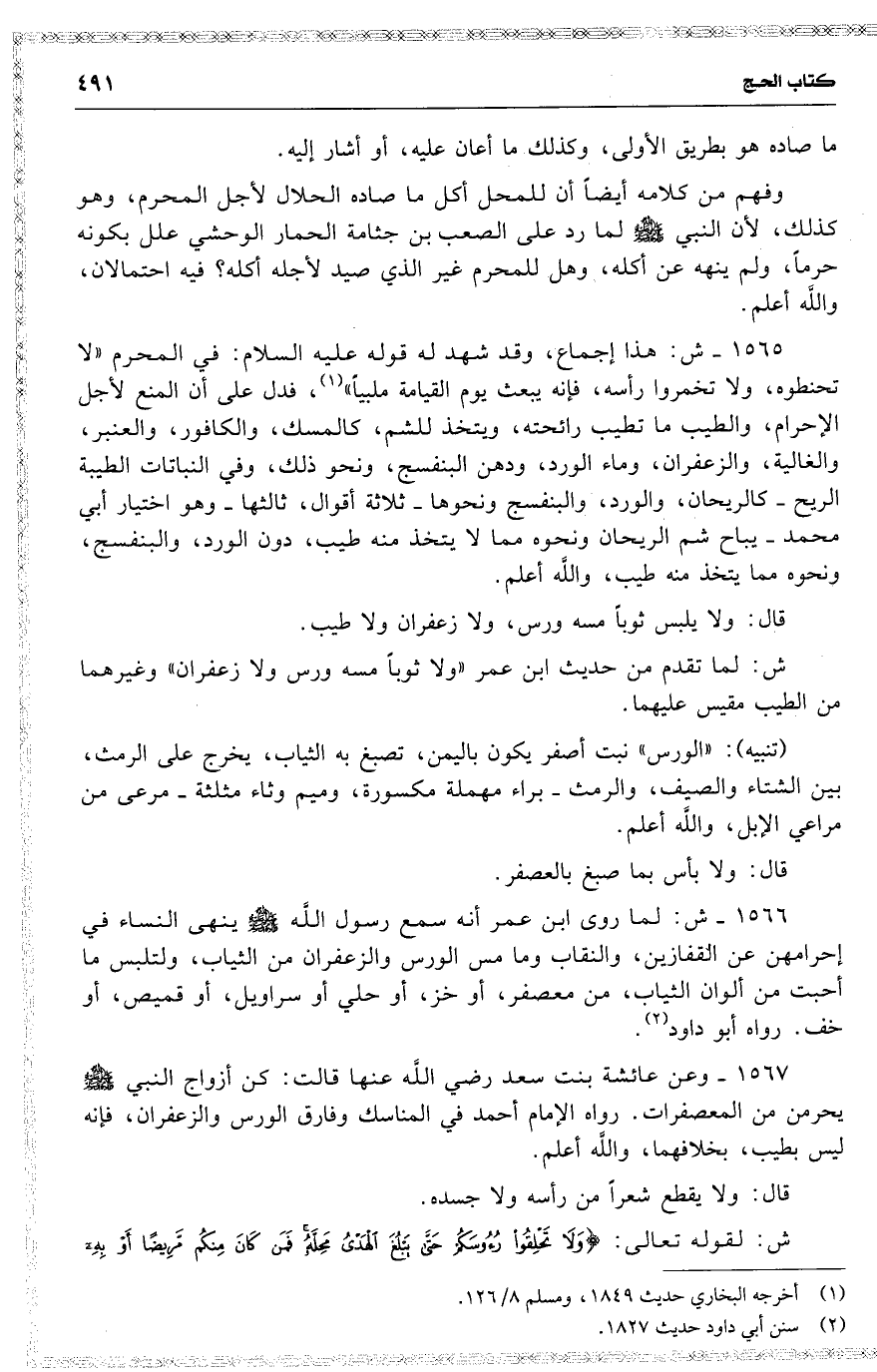 1567 وعن عائشة بنت سعد رضي اللَّه عنها قالت : 16 ( كن أزواج النبي يحرمن من المعصفرات ) . رواه الإمام أحمد في المناسك وفارق الورص والزعفران ، فإنه ليس بطيب ، بخلافهما ، واللَّه أعلم .