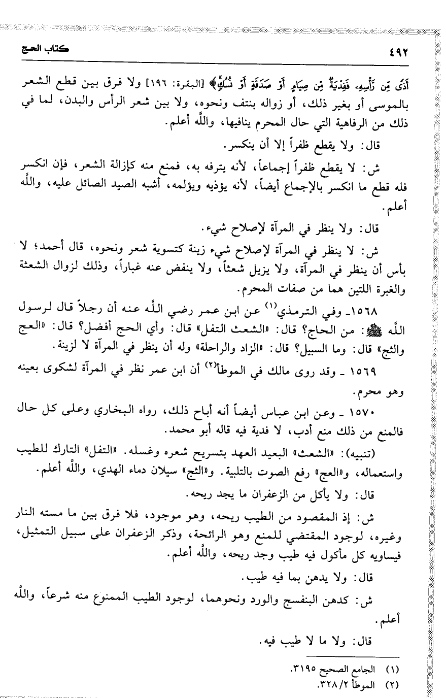 1569 وقد روى مالك في الموطأ 6 ( أن ابن عمر نظر في المرآة لشكوى بعينه وهو محرم ) .