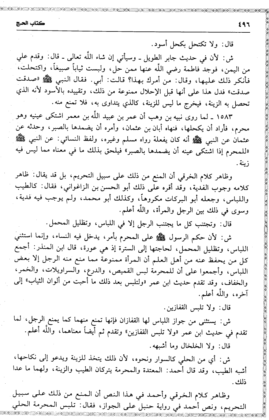 وظاهر كلام الخرقي و أحمد في هذا النص أن المنع من ذلك على سبيل التحريم ، ونص [ أحمد ] في رواية حنبل على الجواز ، فقال : تلبس المحرمة الحلي