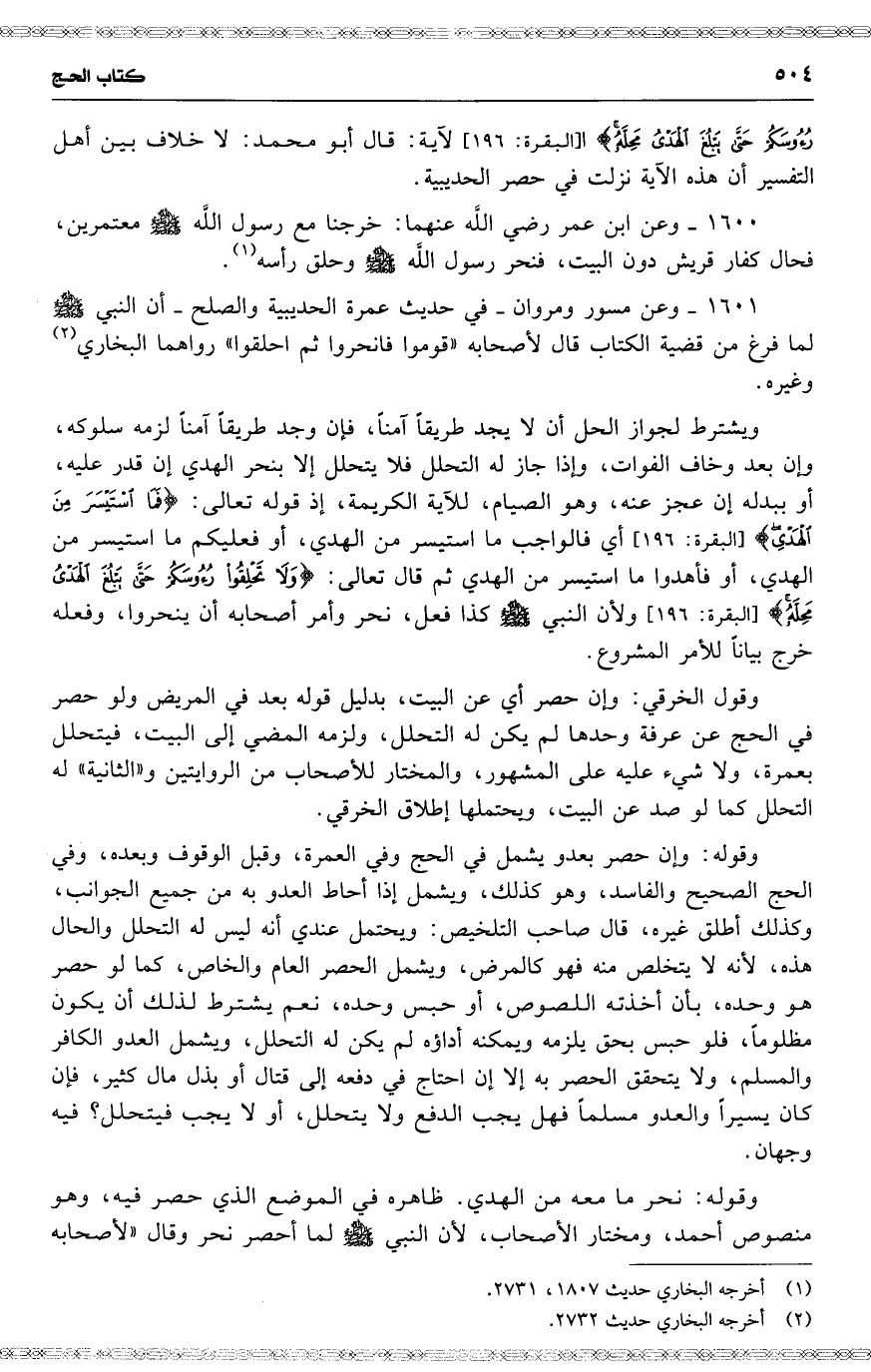 1600 وعن ابن عمر رضي اللَّه عنهما : )6 ( خرجنا مع رسول اللَّه معتمرين ، فحال كفار قريش دون البيت ، فنحر رسول اللَّه وحلق رأسه .