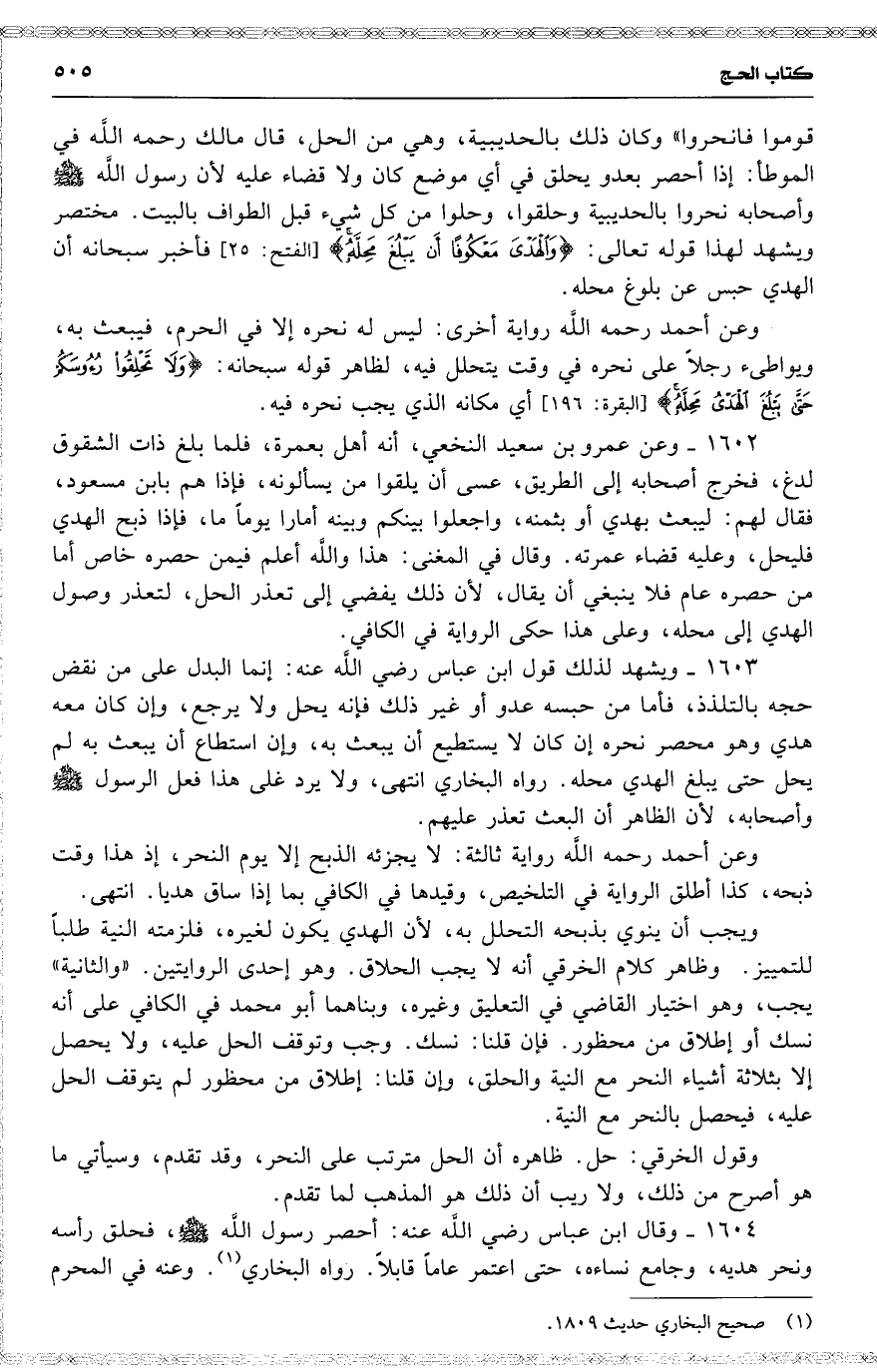 1603 ويشهد لذلك قول ابن عباس رضي اللَّه عنه : إنما البدل على من نقض حجه بالتلذذ ، فأما من حبسه عدو أو غير ذلك فإنه يحل ولا يرجع ، وإن كان معه هدي وهو محصر نحره إن كان لا يستطيع أن يبعث به ، وإن استطاع أن يبعث به لم يحل حتى يبلغ الهدي محله . رواه البخاري انتهى ، ولا يرد غلى [ هذا ] فعل الرسول وأصحابه ، لأن الظاهر أن البعطث تعذر عليهم .