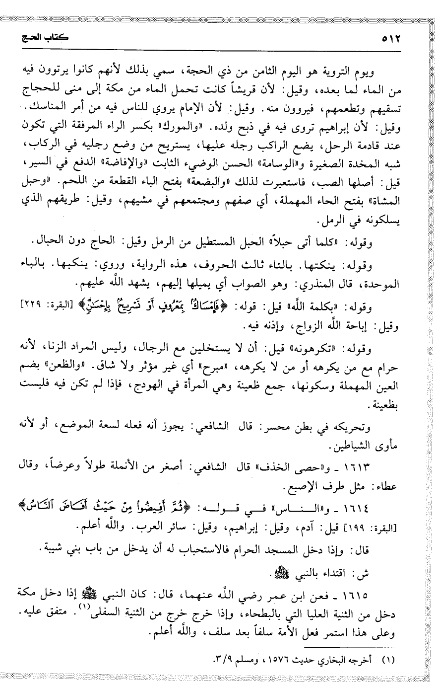 ويوم التروية هو [ اليوم ] الثامن من ذي الحجة ، سمي بذلك لأنهم كانوا يرتوون فيه من الماء لما بعده ، وقيل : لأن قريشاً كانت تحمل الماء من مكة إلى منى للحجاج تسقيهم وتطعمهم ، فيروون منه . وقيل : لأن الإمام يروي للناس فيه من أمر المناسك . وقيل : لأن إبراهيم تروى فيه في ذبح ولده . ( والمورك ) بكسر الراء المرفقة التي تكون عند قادمة الرحل ، يضع الراكب رجله عليها ، يستريح من وضع رجليه في الركاب ، شبه المخدة الصغيرة و ( الوسامة ) الحسن الوضيء الثابت ( والإفاضة ) الدفع في السير ، قيل : أصلها الصب ، فاستعيرت لذلك ( والبضعة ) بفتح الباء القطعة من اللحم . ( وحبل المشاة ) بفتح الحاء المهملة ، أي صفهم ومجتمعهم في مشيهم ، وقيل : طريقهم الذي يسلكونه في الرمل .