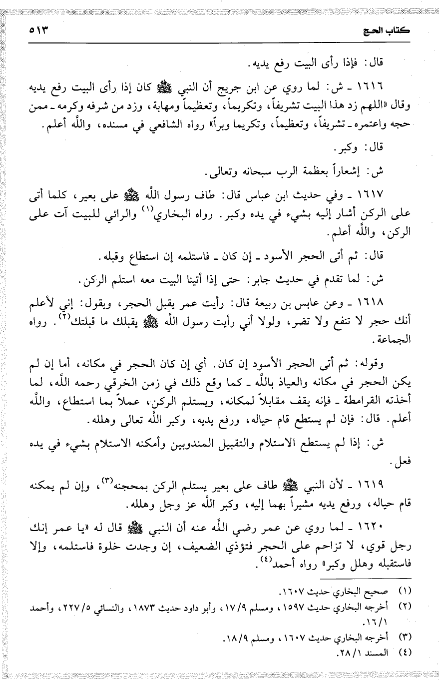 1617 وفي حديث ابن عباس قال : طاف رسول اللَّه على بعير ، كلما أتى [ على ] الركن أشار إليه بشيء في يده وكبر . رواه البخاري والرائي للبيت آت على الركن ، واللَّه أعلم .