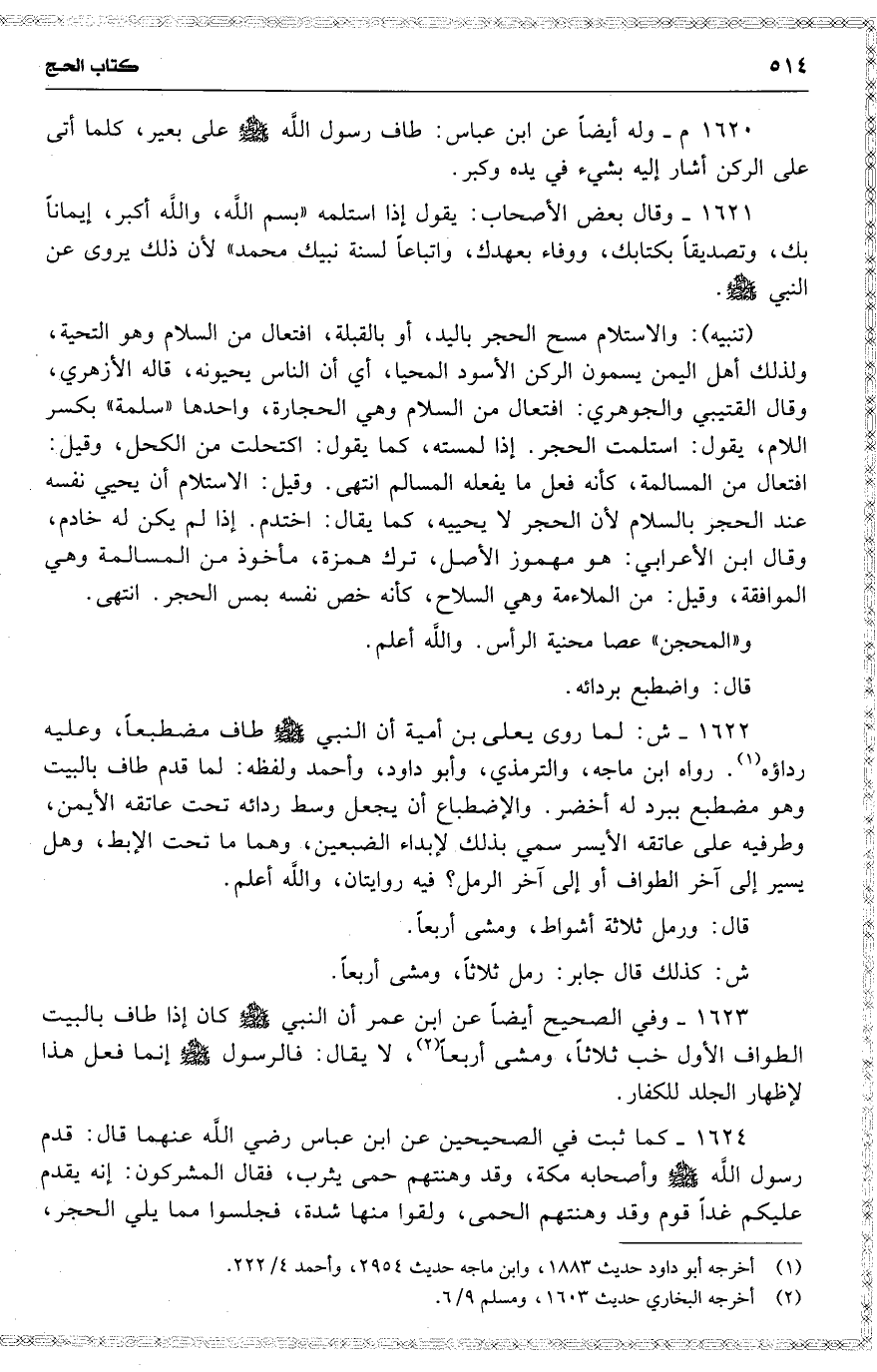 1622 ش : لما روى يعلى بن أمية أن النبي طاف مضطبعاً ، وعليه رداؤه . رواه ابن ماجه ، والترمذي ، وأبو داود ، وأحمد ولفظه : لما قدم طاف بالبيت وهو مضطبع ببرد له أخضر . والإضطباع أن يجعل وسط ردائه تحت عاتقه الأيمن ، وطرفيه على عاتقه الأيسر [ سمي بذلك لإبداء الضبعين ، وهما ما تحت الإبط ، وهل يسير إلى آخر الطواف أو إلى آخر الرمل ؟ فيه روايتان ، واللَّه أعلم ] .