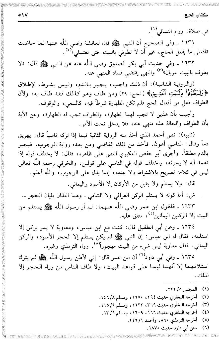 1631 وفي الصحيح أن النبي قال لعائشة رضي اللَّه عنها [ لما حاضت ] ( فعلي ما يفعل الحاج ، غير أن لا تطوفي بالبيت حتى تغتسلي ) .