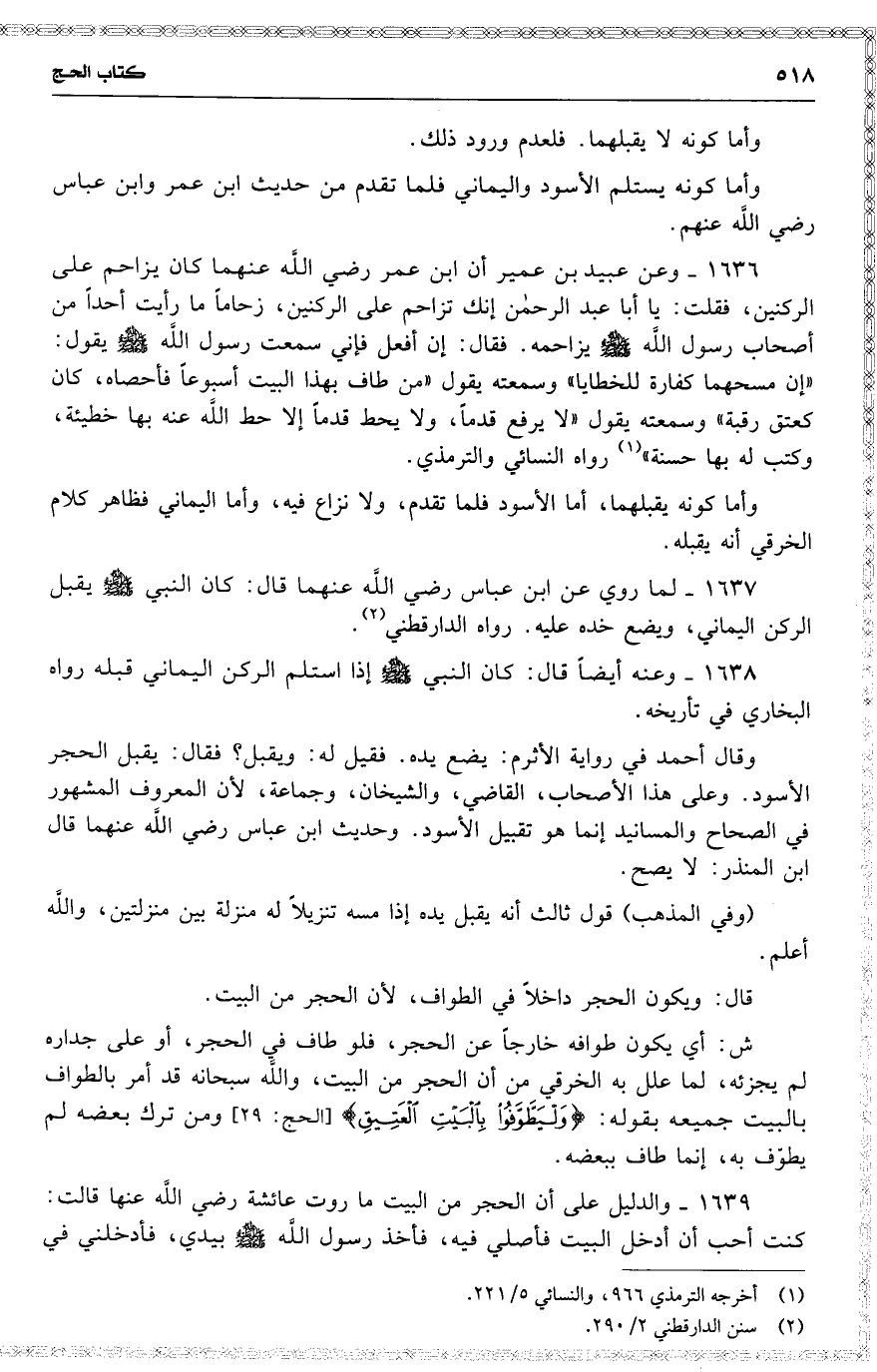 1636 وعن عبيد بن عمير أن ابن عمر رضي اللَّه عنهما كان يزاحم على الركنين ، فقلت : يا أبا عبد الرحمن إنك تزاحم على الركنين ، زحاماً ما رأيت أحداً من أصحاب رسول اللَّه يزاحمه . فقال : إن أفعل فإني سمعت رسول اللَّه يقول : ( إن مسحهما كفارة للخطايا ) وسمعته يقول ( من طاف بهذا البيت أسبوعاً فأحصاه ، كان كعتق رقبة ) وسمعته يقول ( لا يرفع قدماً ، ولا يحط قدماً إلا حط الَّه عنه بها خطيئة ، وكتب له بها حسنة ) رواه النسائي والترمذي .