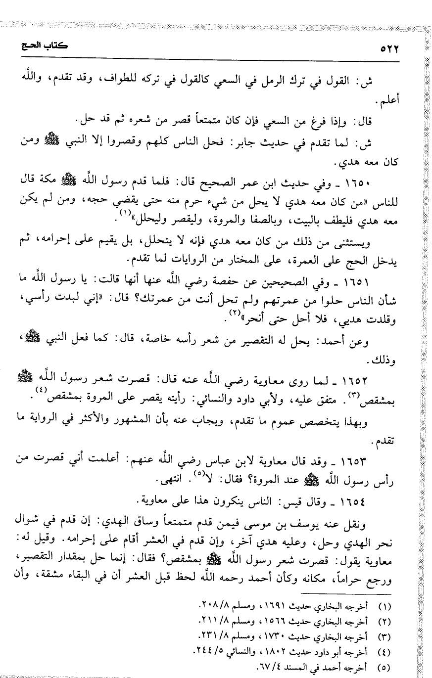 1653 وقد قال معاوية لابن عباس رضي اللَّه عنهم : أعلمت أني قصرت من رأس رسول اللَّه عند المروة ؟ فقال : لا . انتهى .