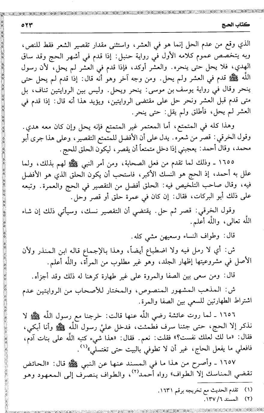 1657 وأصرح من هذا ما في المسند عنها عن النبي قال : ( الحائض تقضي المناسك إلا الطواف ) رواه أحمد ، والطواف ينصرف إلى المعهود وهو